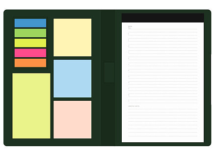 Блокнот со стикерами выполнен из искусственной кожи в твердой обложке. Материал рельефный, приятный на ощупь, напоминает джинсу. Внутри вы найдете: блокнот из 70 страниц, стикеры, а также петлю для ручки. Стикеры выполнены в 3-х размерах: 3 квадратных разноцветных набора (размер: 55х55 мм), 1 набор прямоугольных (размер: 55х95 мм) и набор из 5 разноцветных закладок. Блокнот надежно закрывается на магнитную застежку.