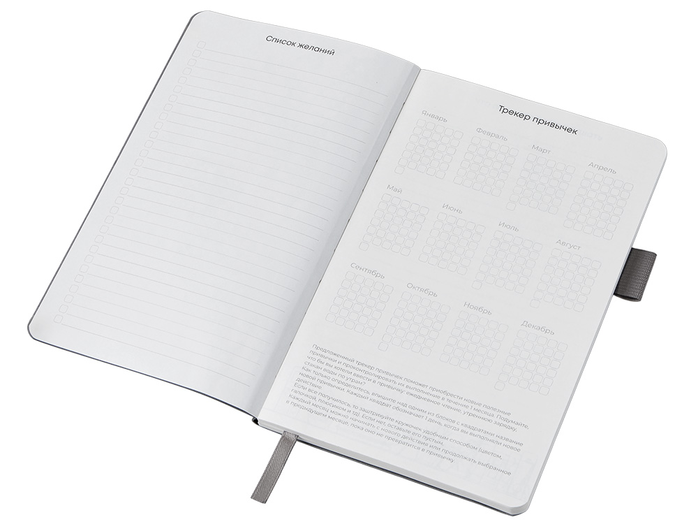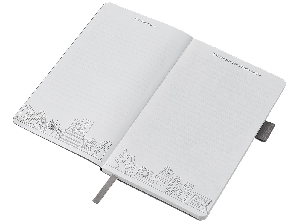 Стильный блокнот в гибкой обложке из текстурной искусственной кожи, приятной на ощупь. 96 очень приятных на ощупь листов повышенной гладкости с FSC-сертификатом обеспечивают комфортное письмо и аккуратный вид записей. Необычный для блокнота вводный блок включает трекер привычек, списки книг и фильмов, а также 4 страницы для раскрашивания с картинками и мандалами. Продуманные детали — резинка для закрытия, петля для ручки и ляссе — делают использование максимально удобным. Благодаря конверту для мелочей вам всегда будет куда положить визитки, записки и другие мелочи. Идеальный вариант для выстраивания баланса между работой и отдыхом.