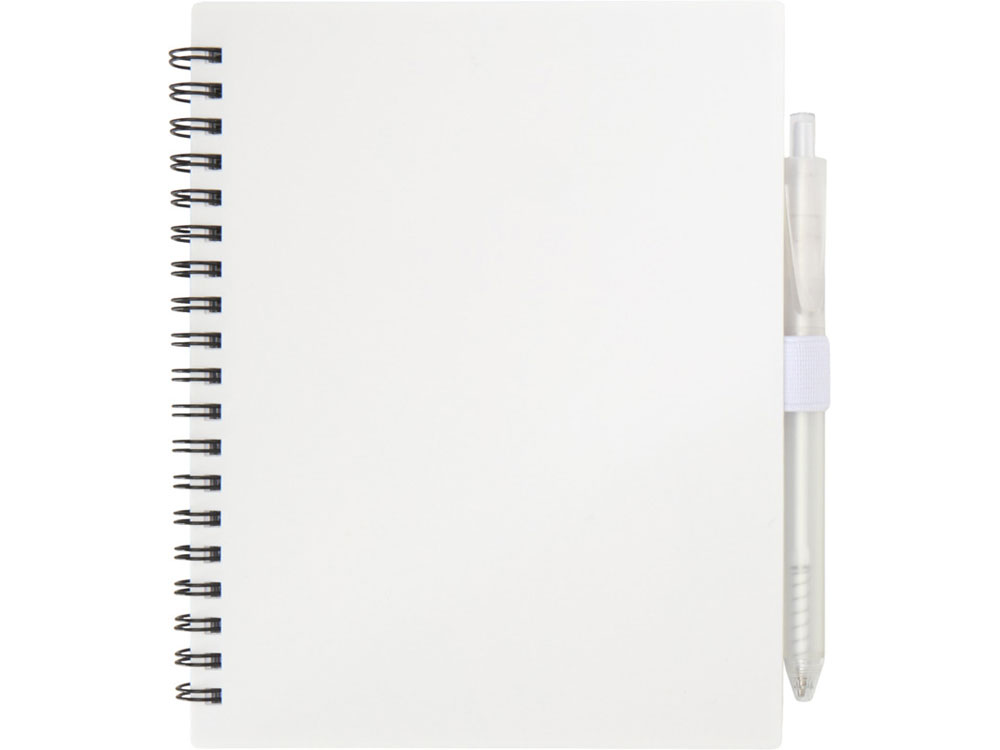 Блокнот Niove с мягкой обложкой изготовлен из переработанной пластмассы, имеет 70 нелинованных листов из бумаги плотностью 70 г/м². Блокнот имеет квадратные углы и петлю для ручки. Размер блокнота: 140 х 178 мм. Шариковая ручка также изготовлена из переработанной пластмассы. Цвет чернил: синий. Длина непрерывной линии: 1000 метров. Диаметр пишущего узла: 1,0 мм.