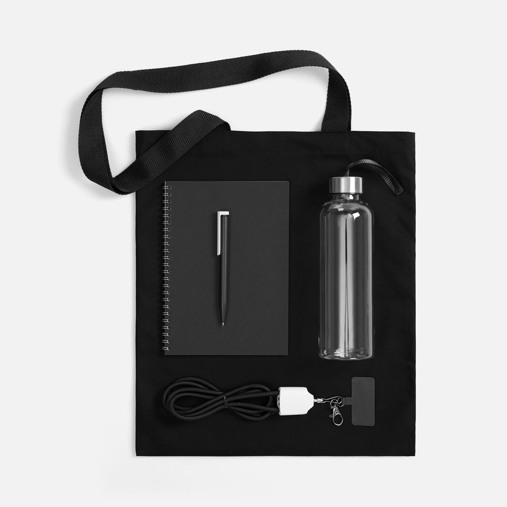 сумка - хлопок, 240 г/м²; ручки - полиэстер; кабель-ланьярд - нейлон, пластик; металл; бутылка - пластик, пищевой; крышка - металл, пластик; блокнот - бумага, картон; ручка - пластик
