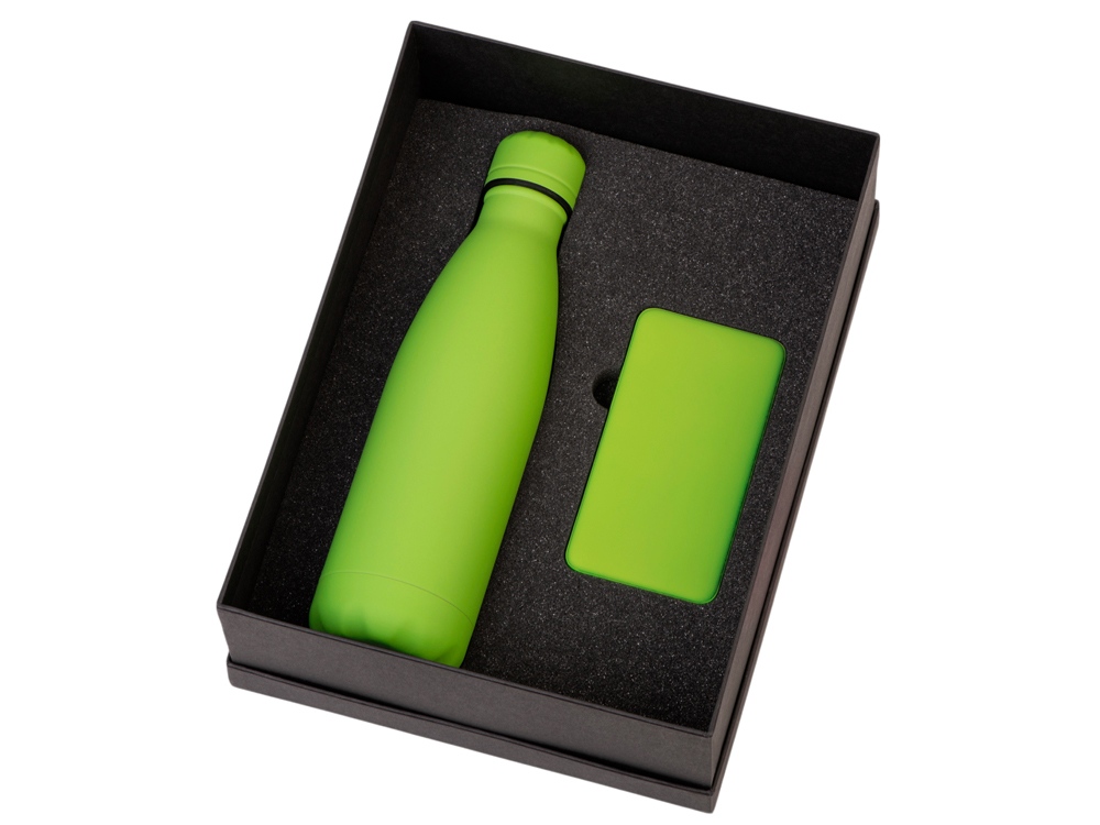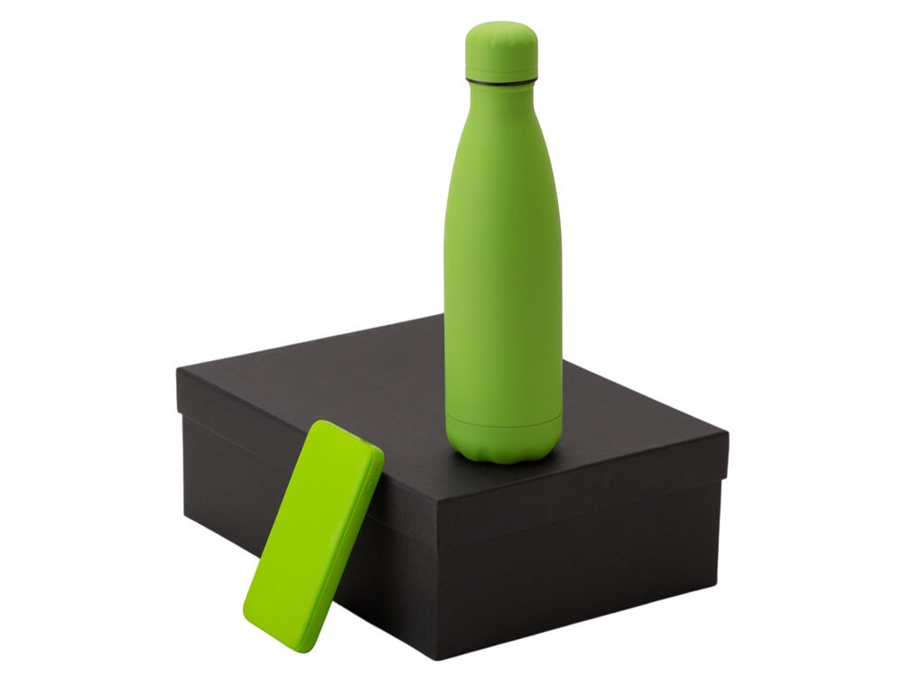 повербанк- пластик с покрытием софт-тач, термобутылка- нержавеющая cталь с покрытием софт-тач