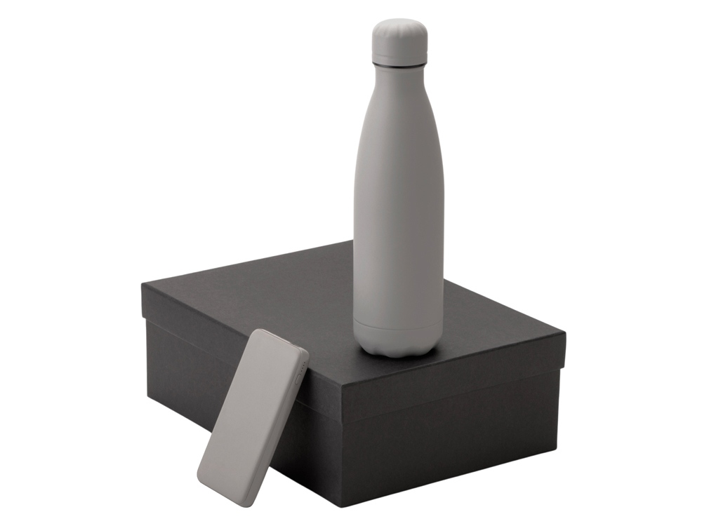 повербанк- пластик с покрытием софт-тач, термобутылка- нержавеющая cталь с покрытием софт-тач