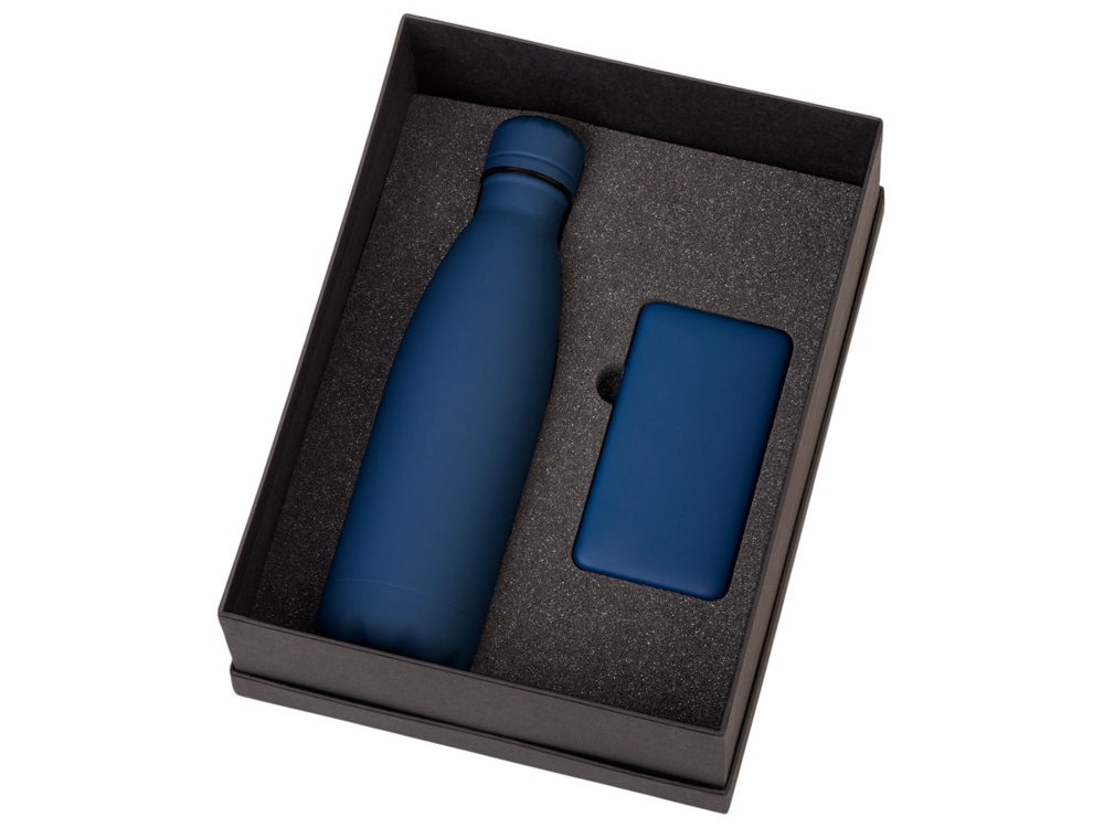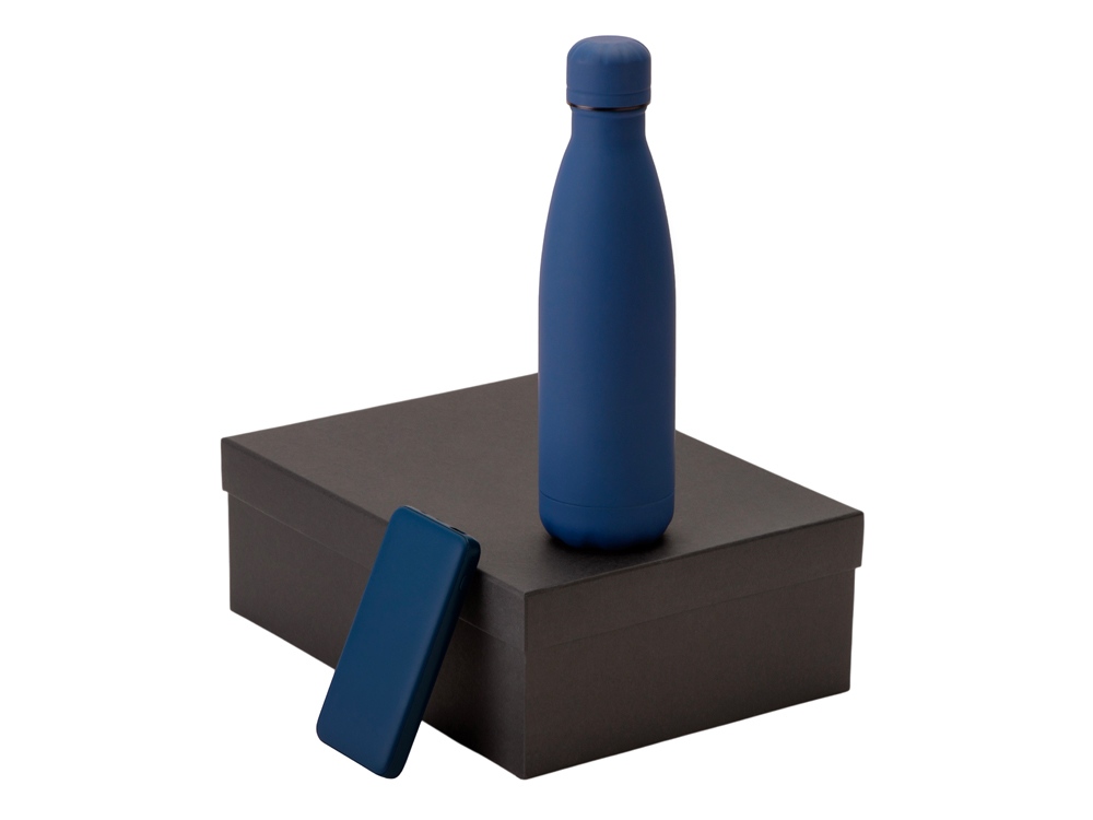 повербанк- пластик с покрытием софт-тач, термобутылка- нержавеющая cталь с покрытием софт-тач