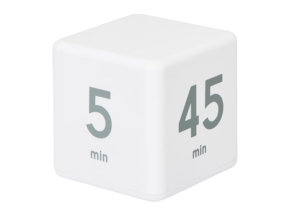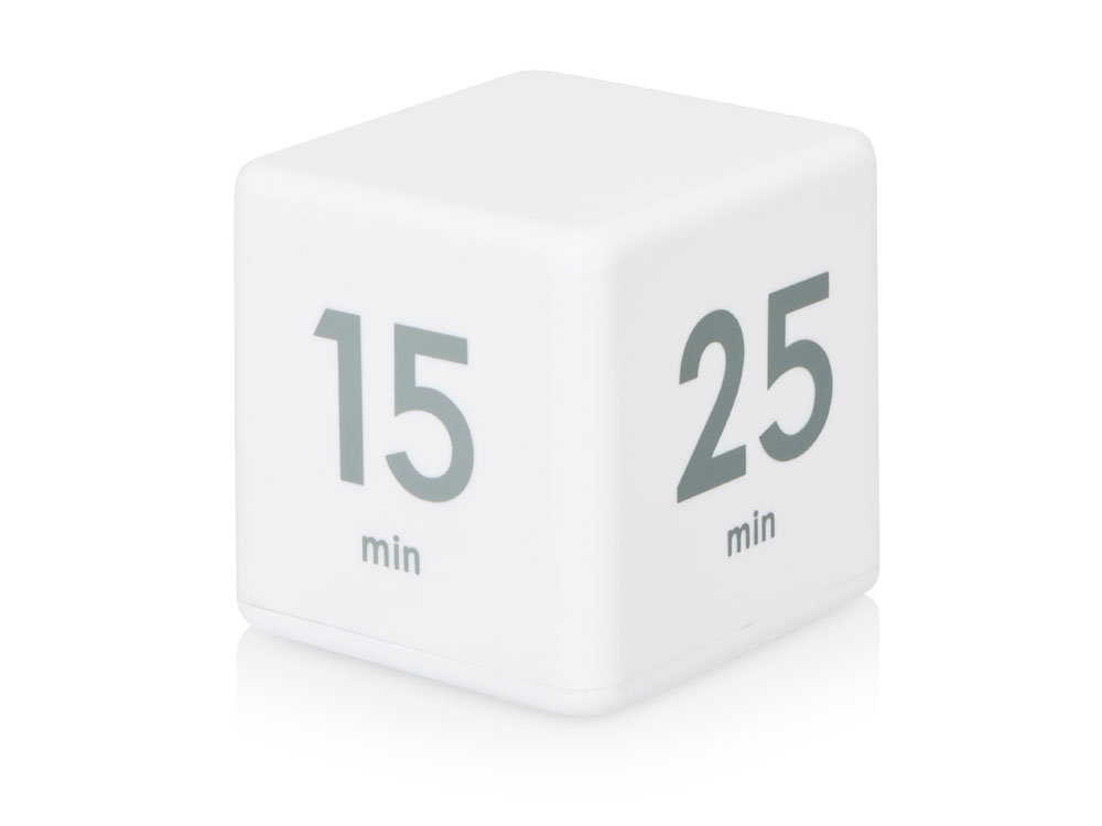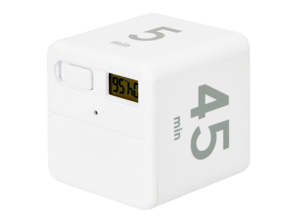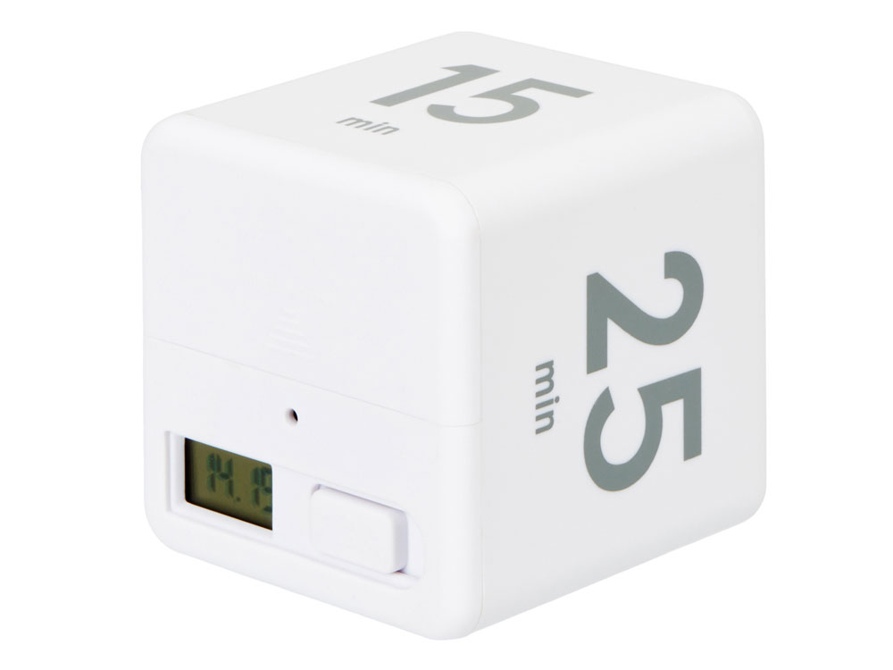 Ваш идеальный помощник дома и на работе - цифровой таймер в виде кубика. На сторонах куба напечатаны четыре предустановленных времени обратного отсчета (5, 15, 25 и 45 минут). Просто включите таймер и поверните его нужной цифрой наверх для начала отсчета времени. Когда время закончится, раздастся звуковой сигнал. Данный таймер имеет огромное количество возможностей для применения - незаменим для офисного таймменджмента, домашней работы, занятий спортом и т.д. Благодаря покрытию софт-тач кубик очень приятный на ощупь.