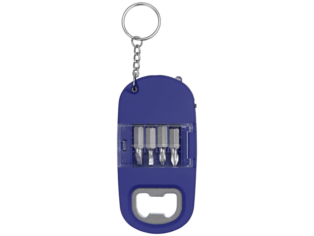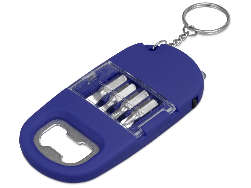Брелок включает в себя 2 плоские и 2 крестообразные насадки, прочную металлическую открывалку и небольшой фонарик. Корпус сделан из плотного пластика с мягким покрытием soft-touch. Встроенный фонарик позволяет подсвечивать рабочую зону.