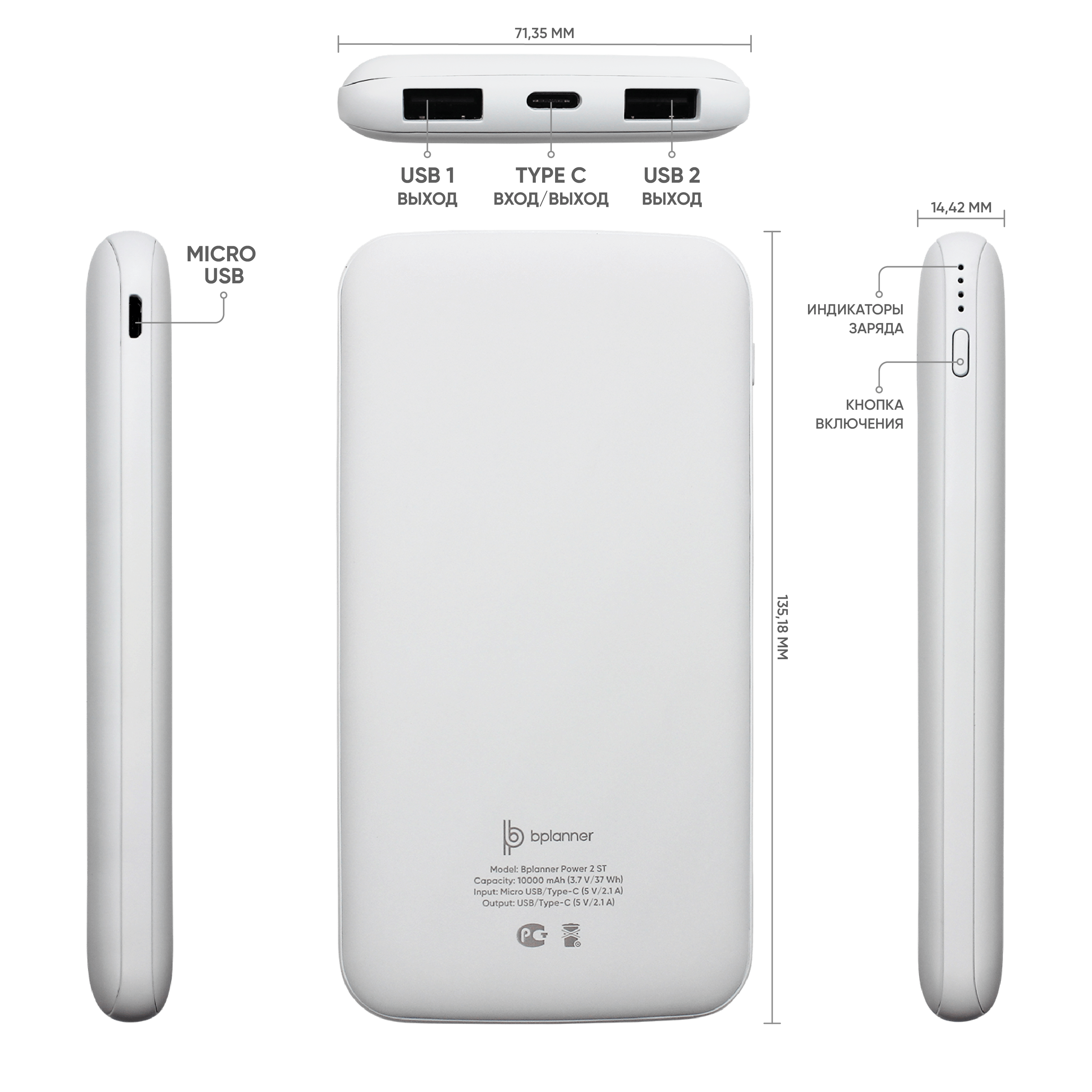Внешний софт-тач аккумулятор Bplanner Power 2ST емкостью 10000 mAh может одновременно заряжать 2 устройства. Дизайн аккумулятора лаконичен. Внешний аккумулятор оснащен индикатором заряда на боковой панели корпуса и входом Type С и Micro-USB. В комплекте идет кабель 3 в 1 и инструкция. Комбинируется с ежедневниками Bplanner 1, Bplanner 2, Bplanner 4 ,а также ручками с софт-тач покрытием.