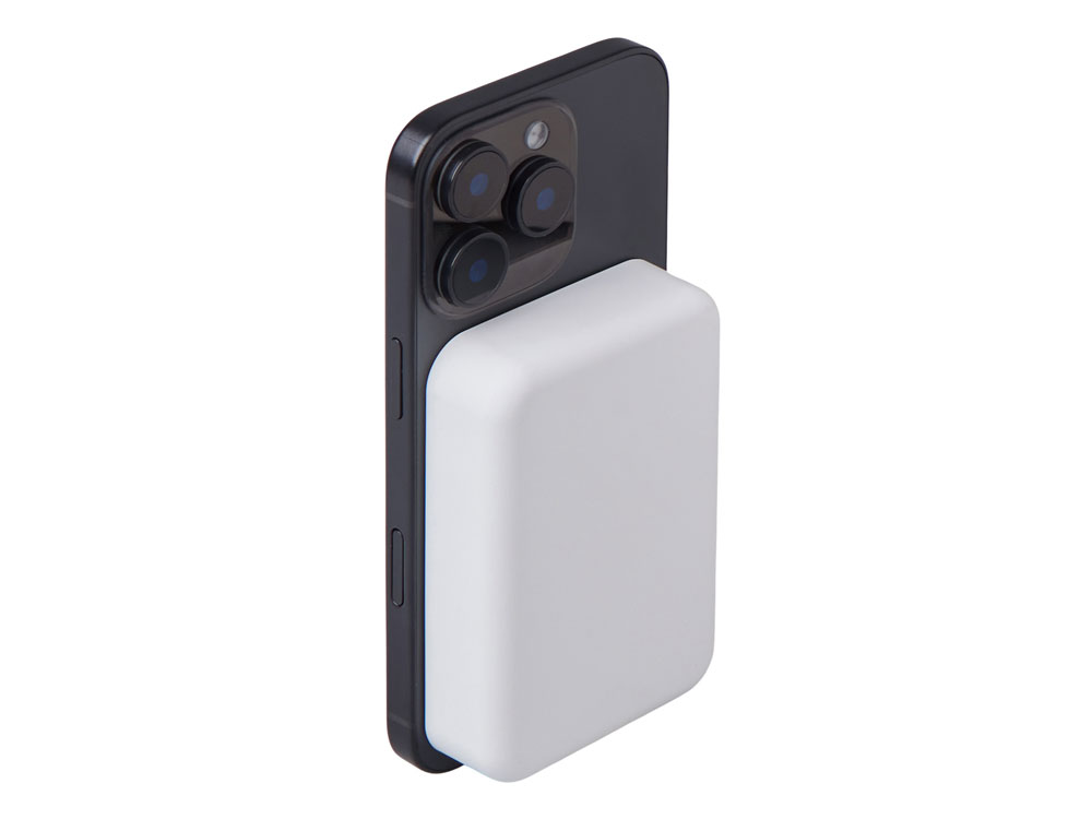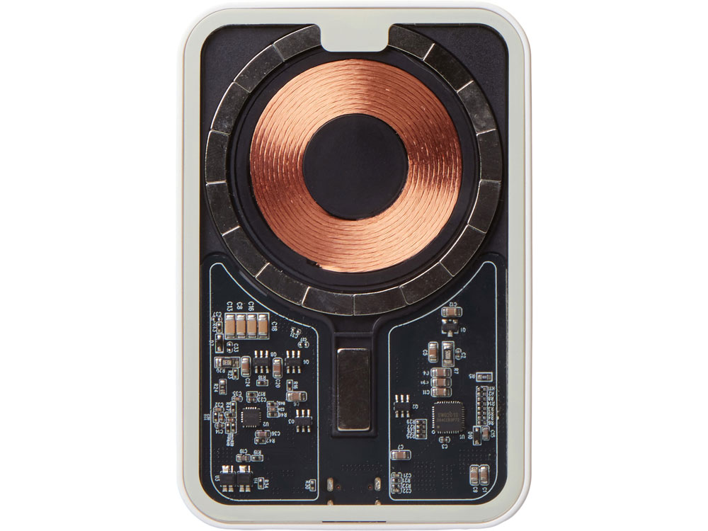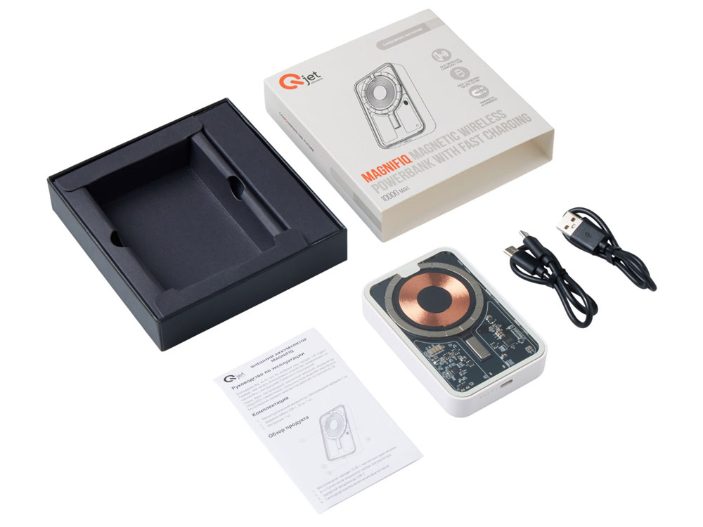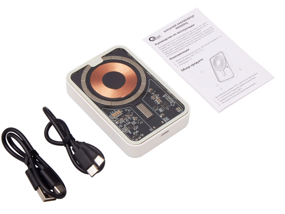 Беспроводной магнитный внешний аккумулятор MagnifIQ — технологичный и стильный power bank с эффектной прозрачной передней панелью, сквозь которую видны мощные магниты, индукционная катушка и электронная начинка. Ёмкость 10 000 мА·ч обеспечивает до 2–3 полных зарядов смартфона, а поддержка быстрой беспроводной зарядки до 15 Вт (с совместимостью QC/PD) делает процесс зарядки максимально быстрым и удобным. Двунаправленный USB-C порт позволяет как заряжать другие устройства, так и сам аккумулятор. Обе стороны корпуса подходят для нанесения логотипа: лицевая — через прозрачную панель, задняя — на приятное на ощупь soft-touch покрытие. Компактный, надёжный и сильный — идеальный технологичный продукт для продвижения и ежедневного использования. Поставляется в качественной упаковке с шубером, Двунаправленный кабель USB-C и кабель USB-A – USB-C в комплекте. • Прозрачная передняя панель — демонстрирует внутреннюю «начинку» и подчеркивает технологичность бренда. • Магнитная беспроводная зарядка 15 Вт • Ёмкость 10 000 мА·ч — хватает на несколько полных зарядов смартфона. • Двунаправленный USB-C — универсальность для зарядки и подзарядки. • Две зоны нанесения логотипа: на прозрачную панель спереди и на soft-touch покрытие сзади. • Сильные магниты обеспечивают надёжную фиксацию на совместимых устройствах.
