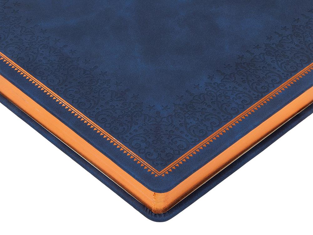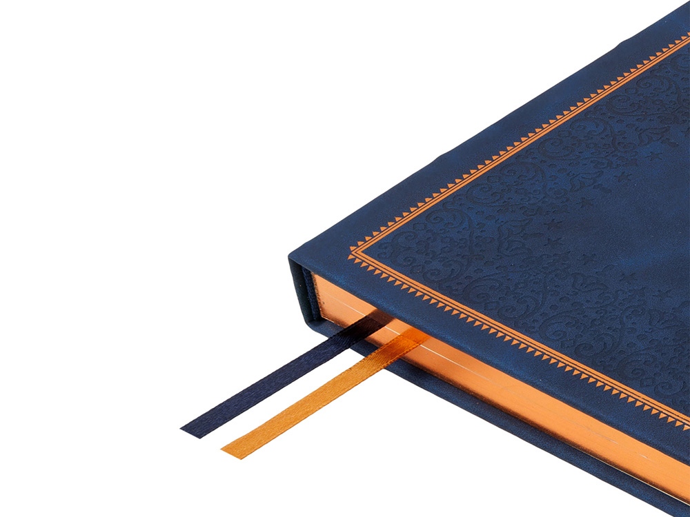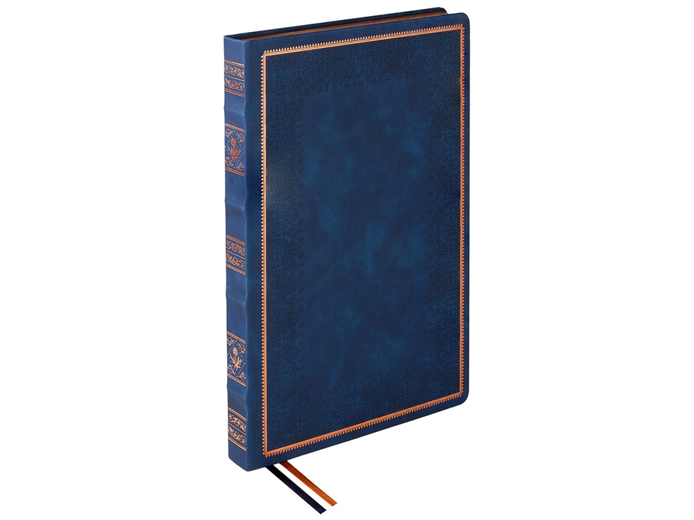 Недатированный ежедневник "Royal" формата А4 с твердой обложкой из искусственной кожи с имитацией нубука украшен художественным бронзовым и блинтовым тиснением. Внутри 192 страницы, выполненные из качественной бежевой бумаги в линейку плотностью 140 г/м². Два шелковых ляссе в цвет обреза блока и обложки облегчают навигацию по записям. Французский корешок дополнительно декорирован изящным бронзовым тиснением в виде виньеток. Скругленные углы обложки и блока подчеркивают стильный дизайн изделия, а блеск бронзового обреза дарит ежедневнику благородный и роскошный внешний вид.