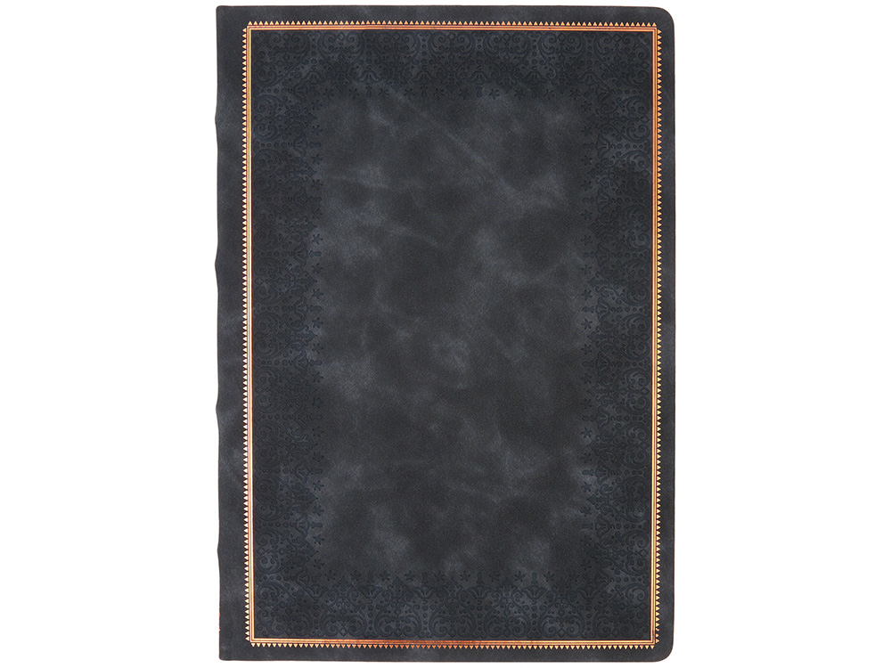 Недатированный ежедневник "Royal" формата А4 с твердой обложкой из искусственной кожи с имитацией нубука украшен художественным бронзовым и блинтовым тиснением. Внутри 192 страницы, выполненные из качественной бежевой бумаги в линейку плотностью 140 г/м². Два шелковых ляссе в цвет обреза блока и обложки облегчают навигацию по записям. Французский корешок дополнительно декорирован изящным бронзовым тиснением в виде виньеток. Скругленные углы обложки и блока подчеркивают стильный дизайн изделия, а блеск бронзового обреза дарит ежедневнику благородный и роскошный внешний вид.