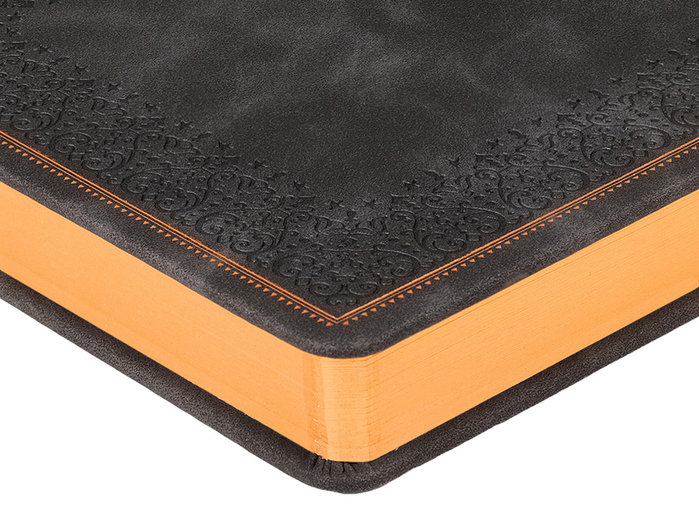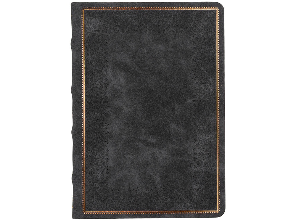 Недатированный ежедневник "Royal" формата А5 с твердой обложкой из искусственной кожи с имитацией нубука украшен художественным бронзовым и блинтовым тиснением. Внутри 256 страниц, выполненных из качественной бежевой бумаги в линейку плотностью 100 г/м². Два шелковых ляссе в цвет обреза блока и обложки облегчают навигацию по записям. Французский корешок дополнительно декорирован изящным бронзовым тиснением в виде виньеток. Скругленные углы обложки и блока подчеркивают стильный дизайн изделия, а блеск бронзового обреза дарит ежедневнику благородный и роскошный внешний вид.