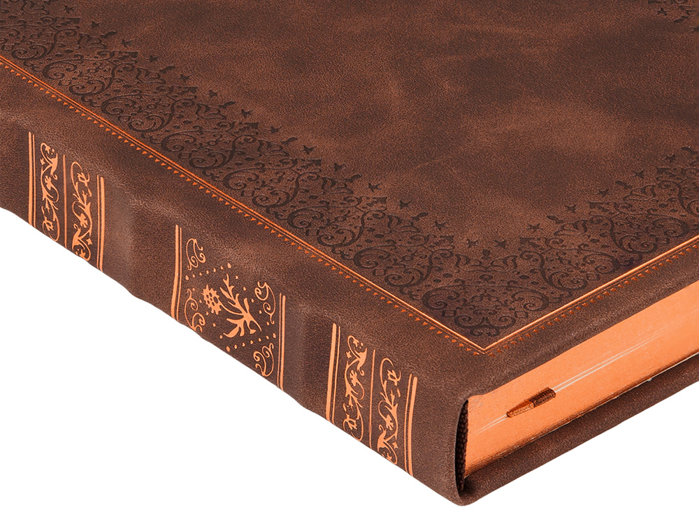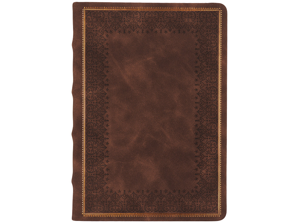Недатированный ежедневник "Royal" формата А5 с твердой обложкой из искусственной кожи с имитацией нубука украшен художественным бронзовым и блинтовым тиснением. Внутри 256 страниц, выполненных из качественной бежевой бумаги в линейку плотностью 100 г/м². Два шелковых ляссе в цвет обреза блока и обложки облегчают навигацию по записям. Французский корешок дополнительно декорирован изящным бронзовым тиснением в виде виньеток. Скругленные углы обложки и блока подчеркивают стильный дизайн изделия, а блеск бронзового обреза дарит ежедневнику благородный и роскошный внешний вид.