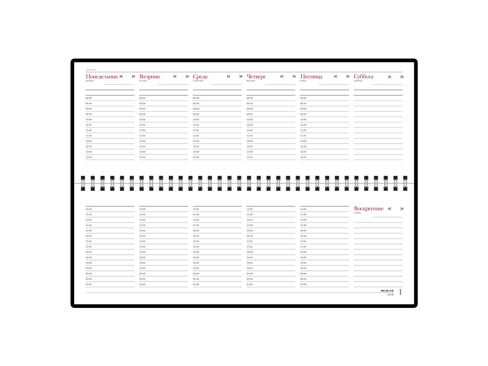 Недатированный планинг выпускается размером 305*130 мм и содержит 128 страниц (блок 292 х100 мм). Для них выбрана высококачественная белая бумага плотностью 70 грамм. Разворот представляет собой разметку на 7 дней недели с графами с указанием времени. Месяц и день недели указаны на русском и английском языках. Первые 15 страниц содержат справочные сведения из различных областей на русском языке. Крепление листов на открытом гребне способствует быстрому переходу по страницам. Современная, практичная обложка из приятного на ощупь материала с легким прорезиненным эффектом хорошо подходит для тиснения. Декоративная прострочка нитью в тон подчеркивает закругленную форму обложки.