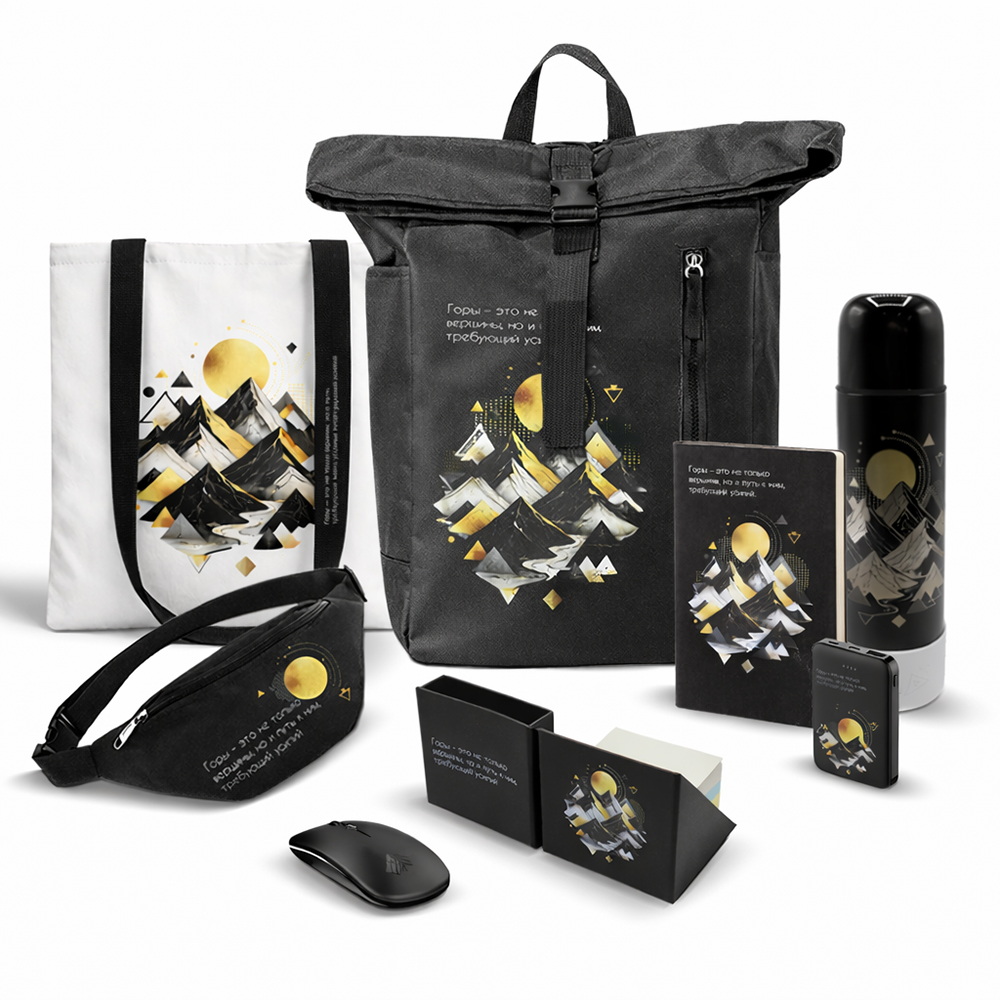 СЕТ «ПУТЬ ЗА ОБЛАКА». «Путь за облака»— это решение для тех, кто не привык ограничивать себя рамками одного офиса. Концепция набора строится вокруг идеи абсолютной мобильности и технологичности, позволяя перенести рабочее пространство в любую точку маршрута, будь то борт самолета или столик в кафе с видом на город. Свобода в движении: Вашу автономность обеспечивают эргономичный рюкзак ARGON и компактная поясная сумка Shift, которые грамотно распределяют нагрузку в пути. Технологический стек из беспроводной мыши Seven и аккумулятора Fluffy стирает границы между «офисом» и «домом», а термос Picnic Bright To Go гарантирует, что правильный настрой сохранится в любой климатической зоне. Порядок в деталях: Интеллектуальный фундамент сета — ежедневник Stefano и настольный органайзер Nivora, которые помогают структурировать идеи даже в условиях переменного ритма. Финальный штрих — функциональный шопер TAHOMA, готовый к любым незапланированным задачам вашего путешествия. Состав набора: 1. Внешний аккумулятор Fluffy, 5000 Mah, черный (артикул 2041.02) - 1 шт. 2. Ежедневник A5 недатированный Stefano в мягком переплёте, черный (артикул 51029.02) - 1 шт. 3. Мышь компьютерная беспроводная Seven, черная (артикул 18016.02) - 1 шт. 4. Настольный органайзер с бумажными стикерами Nivora, черный (артикул 49007.02) - 1 шт. 5. Поясная сумка SHIFT, черный (артикул 38003.02) - 1 шт. 6. Рюкзак ARGON, черный (артикул 4055.02) - 1 шт. 7. Сумка для покупок TAHOMA 270 г/м², черный (артикул 25009.02) - 1 шт. 8. Термос Picnic Bright, черный (артикул 5005.02) - 1 шт. 9. Манжета силиконовая для термобутылки Olivia, белый (артикул 5050M.01) - 1 шт.