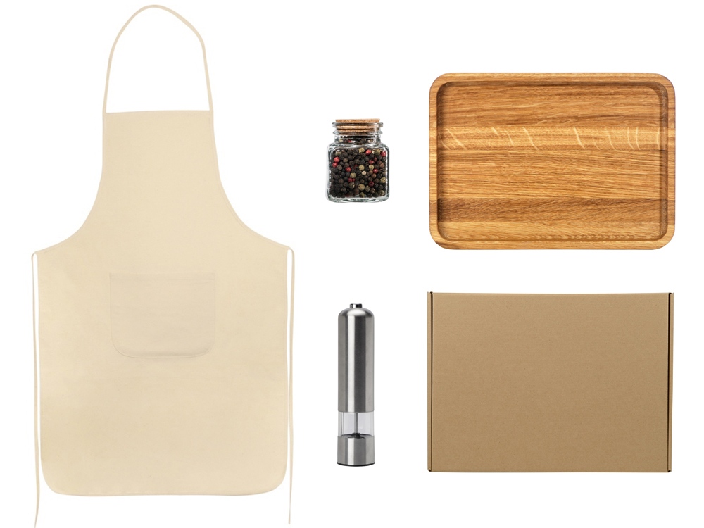 Набор для кухни — это отличный подарок для любого человека, который любит готовить и ценит уют на своей кухне. Классический фартук в нейтральном цвете регулируется на талии тонкими плотными завязками. Выполнен из 100% неокрашенного хлопка, поэтому в нем комфортно и не жарко находиться за плитой. Электрическая мельница подходит для измельчения крупной соли, перца и других специй. Для этого достаточно просто нажать на кнопку на корпусе устройства. Удобная регулировка степени помола от грубого до мелкого с помощью винтового механизма под ёмкостью в нижней части мельницы. Работает от 4-х батареек типа АА (в комплект не входят). Универсальный деревянный поднос выполнен из натурального дуба, обработанного натуральным растительным маслом, которое обеспечивает изделию более долгую жизнь. Подходит не только для сервировки стола и приготовления пищи, но и для организации хранения. Для поддержания внешнего вида и профилактики трещин рекомендуется регулярно протирать поднос льняным или вазелиновым маслом — так древесина дуба дольше будет сохранять свежий внешний вид и яркость. Свежемолотая смесь перцев подойдёт для мяса, стейков, рыбы, овощей, грибов, салатов и соусов. В виде целых горошин перец добавляют в маринады для овощей. Состав: перец черный, белый, зеленый, розовый. - мельница оснащена LED подсветкой для точного контроля количества специй; - керамические жернова мельницы не подвержены корозии; - размер подноса 25х18 см; - подарочная коробка уже входит в набор; - набор подойдёт в качестве подарка не только женщинам, но и мужчинам. Не рекомендуется использовать поднос в посудомоечной машине, микроволновой печи, замачивать в раковине с водой.