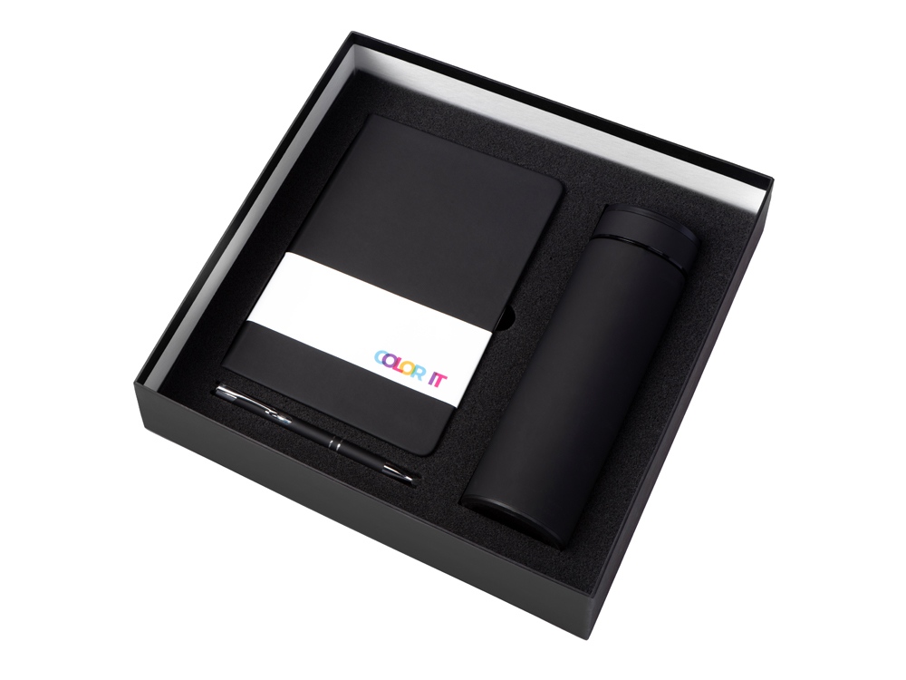 блокнот - полиуретан с покрытием софт-тач, картон, ручка - алюминий с покрытием софт-тач, термос - нержавеющая cталь с покрытием софт-тач, коробка - картон 70 гр/м2 с FSC сертификатом