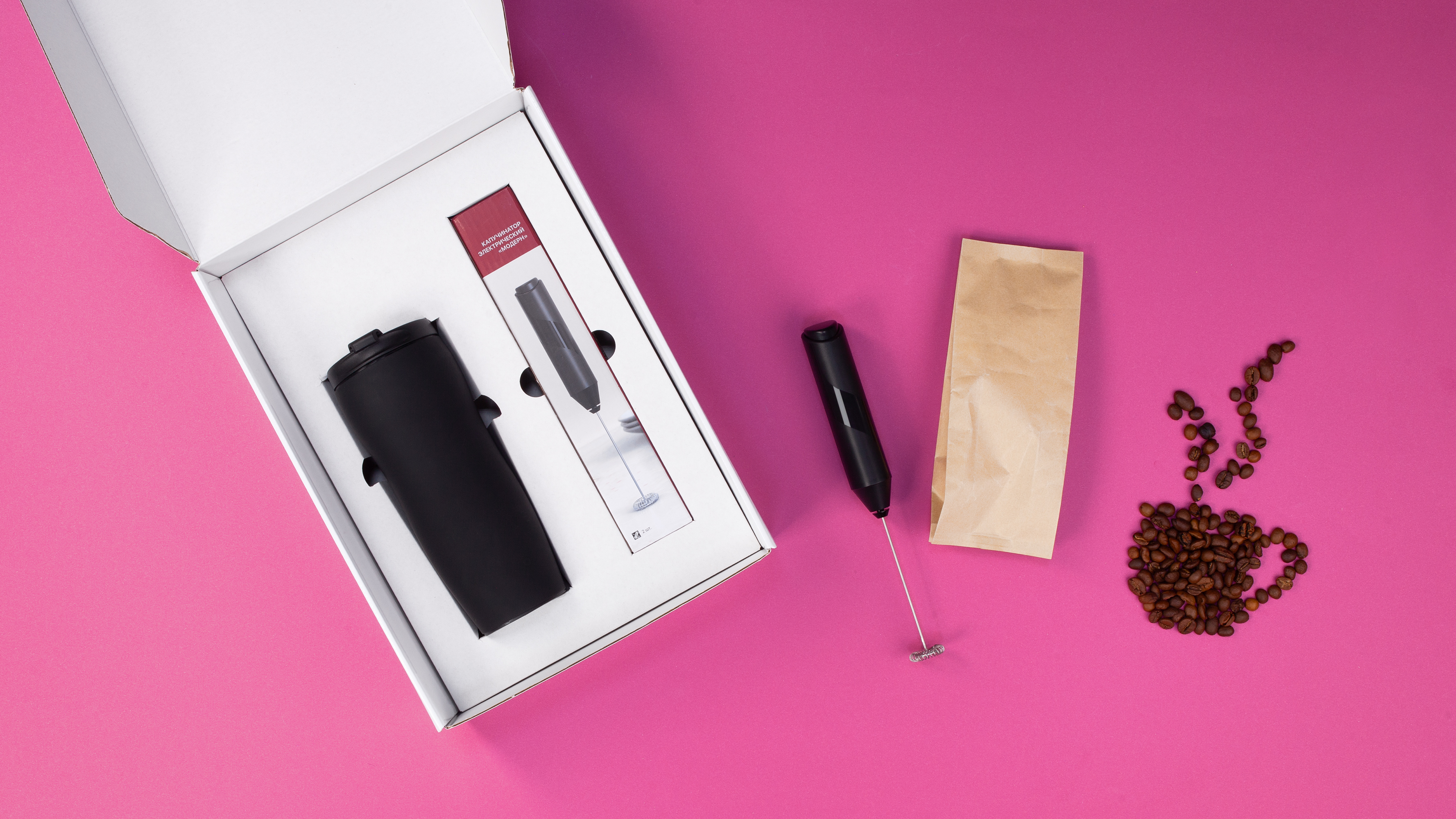 Набор, который станет приятным подарком для всех любителей кофе: зерновой кофе, термостакан и капучинатор для молока, чтобы ваш напиток получился с пенкой!