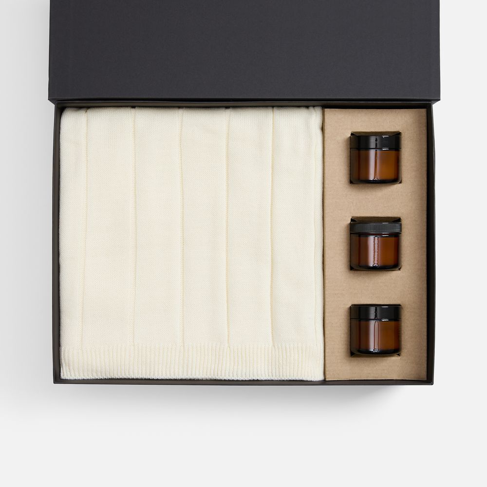 плед - акрил 100%, плотность 310 г/м² ; подсвечник - стекло, крышка - пластик; свеча - парафин, соевый воск, парфюмерная композиция; коробка - переплетный картон, бумага Magic