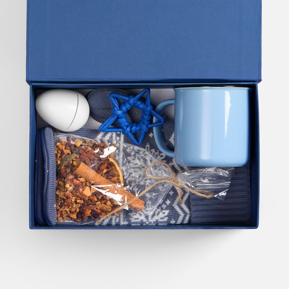варежки - акрил 100%; футляр для бальзама - пластик; кружка - фаянс; плетеная фигурка - бумага; коробка - переплетный картон, бумага Malmero «Скандинавский синий»
