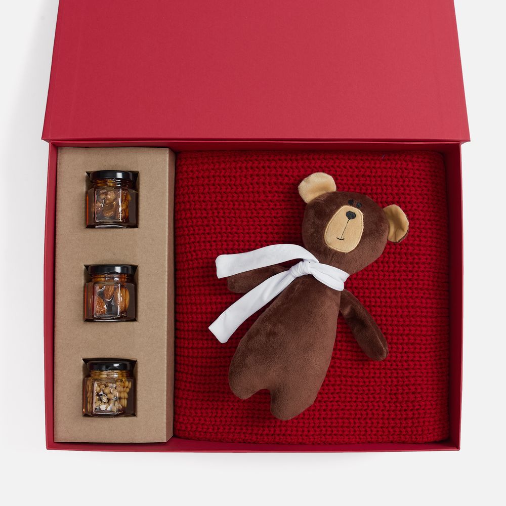 шарф - акрил 100%; игрушка - велюр; набивка, шарфик - полиэстер 100%; баночки для меда - стекло; коробка - переплетный картон, бумага Magic