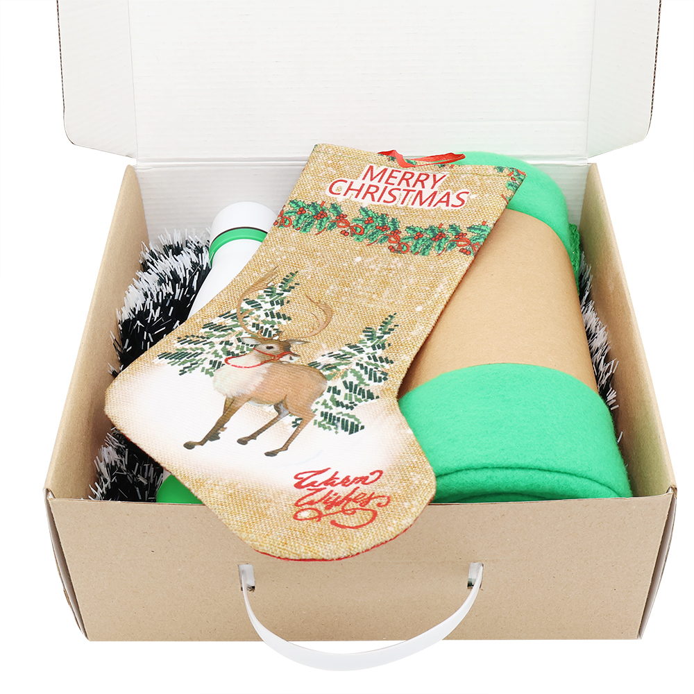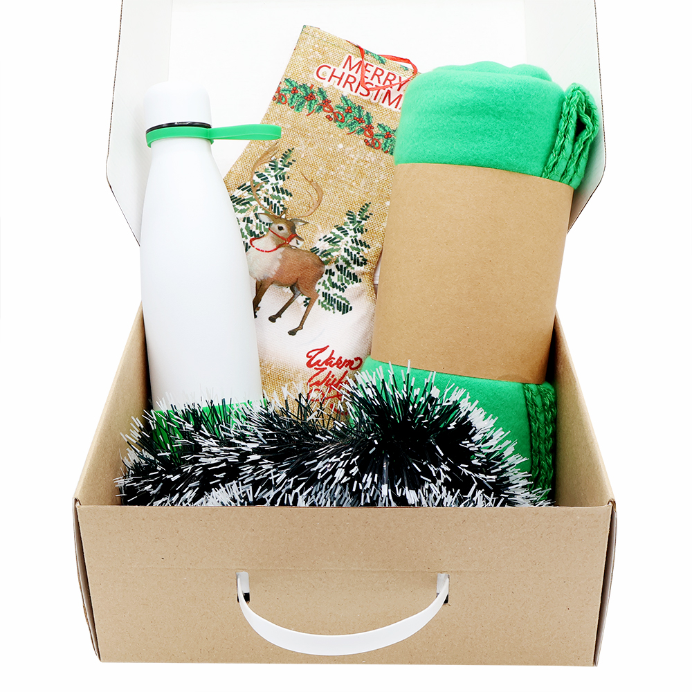 Этот подарочный набор подарит тепло и уют в холодное время года, создавая атмосферу праздника и комфорта. Идеальное сочетание практичности и праздничного настроения. Состав набора: Подарочная коробка из МГК (с ручкой) - артикул 53305 Плед PATIO, зеленый - артикул 16008.24 Вакуумная термобутылка Olivia, белый - артикул 5050.01, кольцо-держатель зеленый; манжета - зеленый Новогодняя мишура - зелено-белый - артикул SYMTA-162079 Сапожок подарочный новогодний №5 — олень бежевый - артикул SYWZ-082008