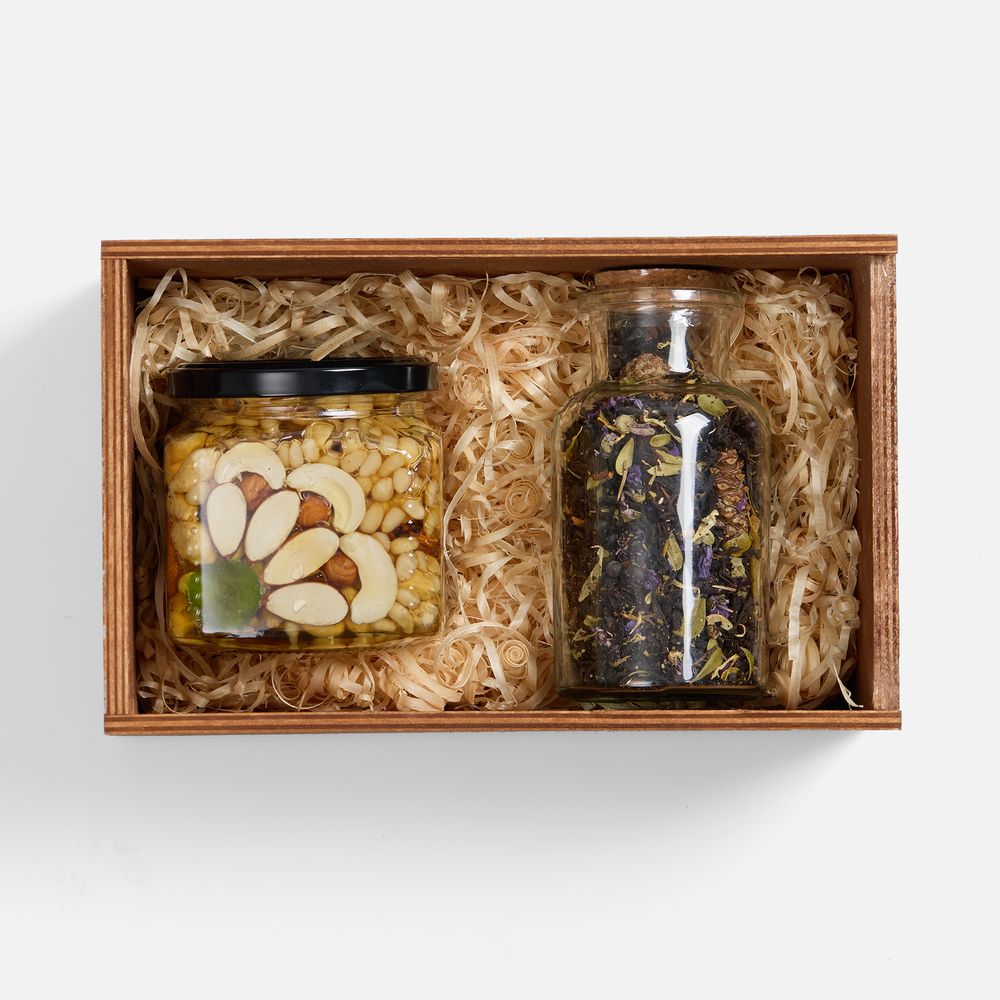 В наборе собраны дары сибирской природы: ароматный медовый десерт с хрустящими орехами, цукатами и семенами и травяной чай «Сила Сибири». В основе чая — крепкий черный чай с лесными травами, ягодами и хвойными нотами, создающими гармоничный вкус со сладковатым послевкусием. Все упаковано в аккуратный деревянный ящик — такой набор станет практичным подарком или приятным дополнением к вечернему чаепитию для тех, кто любит натуральные вкусы и атмосферу уюта.