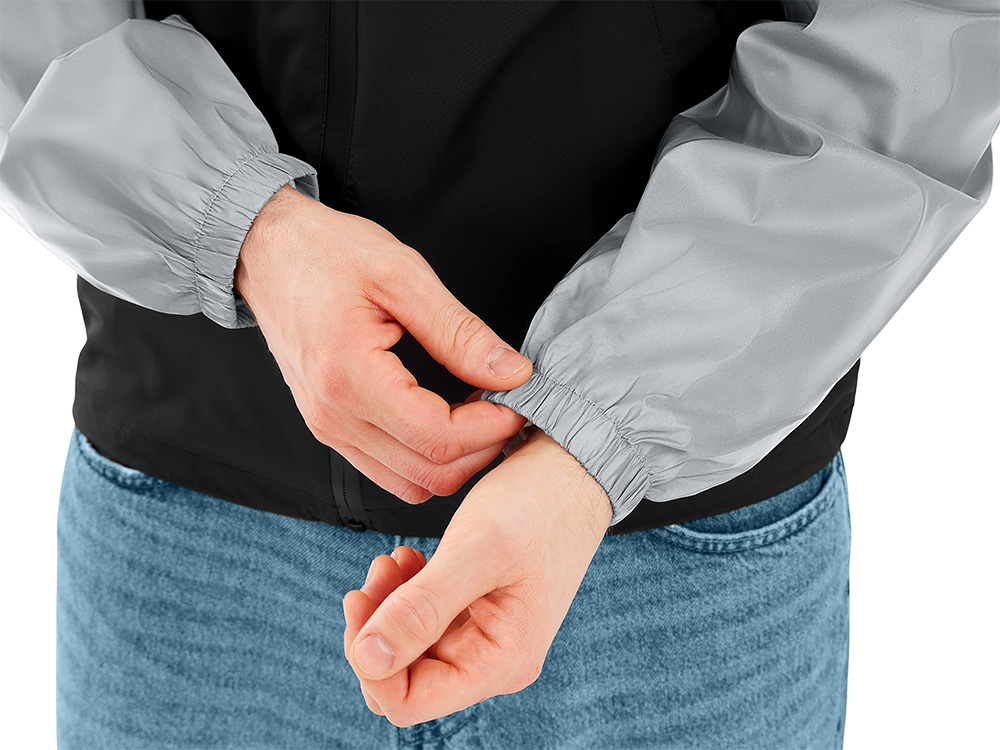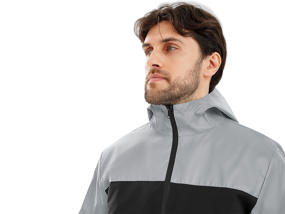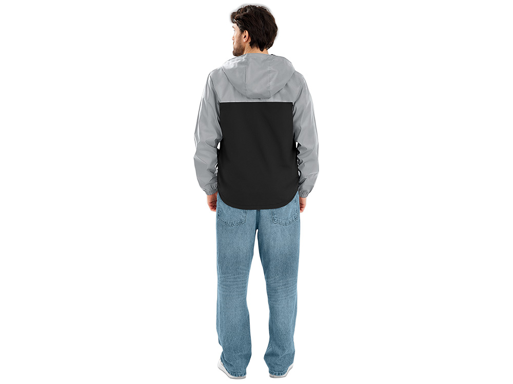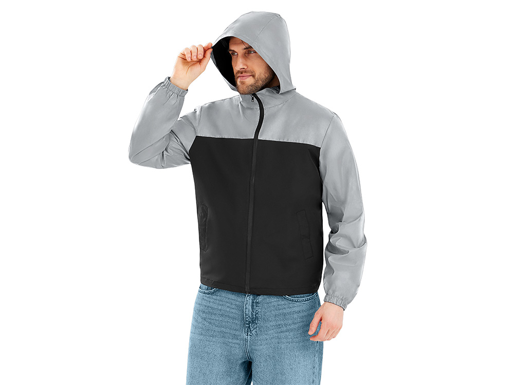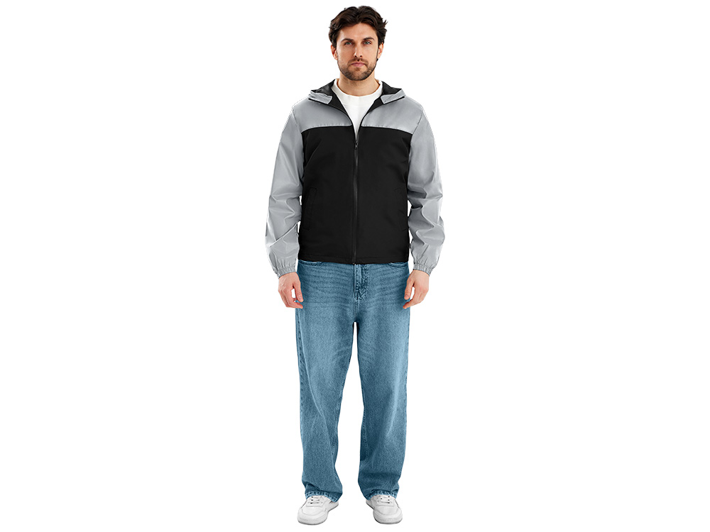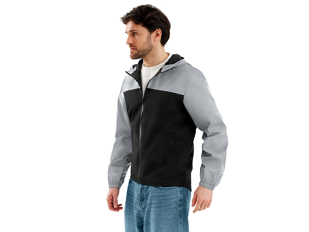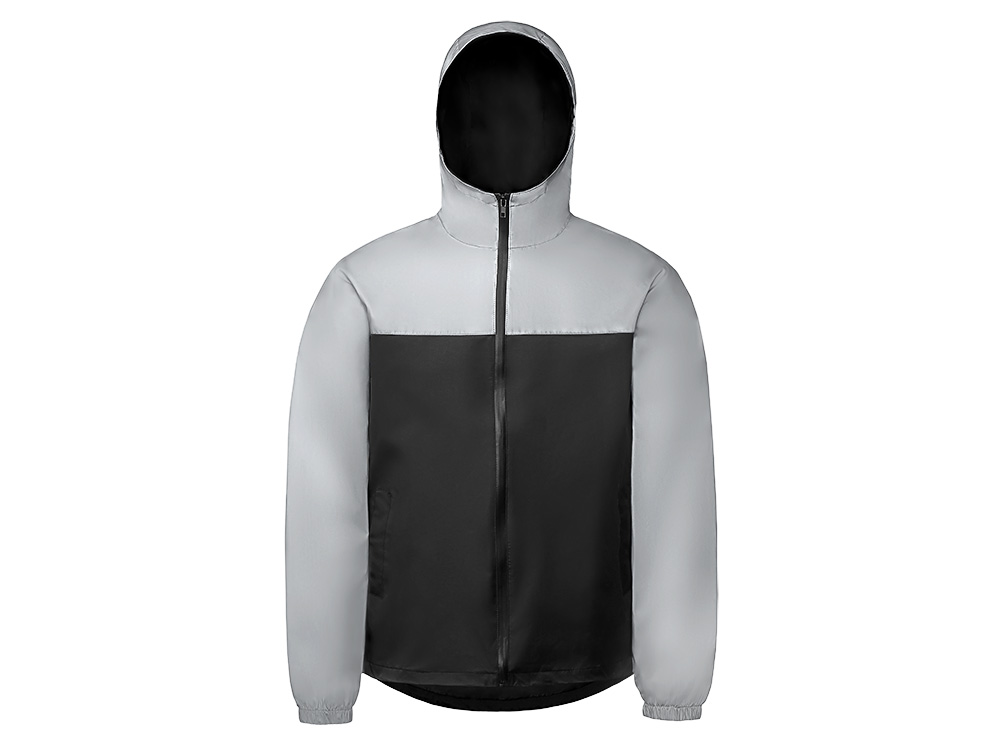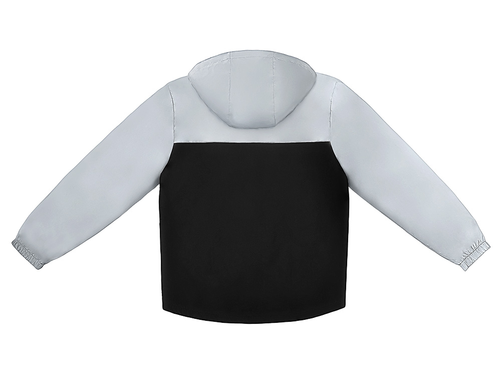 Streetwear-ветровка с контрастным дизайном: верх переда и спинки, рукава и капюшон — из светоотражающей ткани, низ — из прочной чёрной полиэстеровой ткани. Модель на подкладке, со спинкой длиннее переда. Детали: водонепроницаемая молния, боковые наклонные карманы с листочкой, манжеты на резинке, удобный капюшон, кулиска по низу. • Заметность в темноте — светоотражающая верхняя часть повышает безопасность. • Защита от ветра и дождя — влагостойкая молния и плотная ткань. • Комфортная посадка — удлинённая спинка и подкладка для межсезонья. • Универсальный городской стиль — легко сочетается с повседневным гардеробом.
