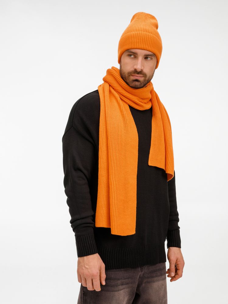 Удлиненная шапка с широким отворотом и фактурной вязкой мягко облегает голову, создавая элегантный силуэт. Широкий шарф с выразительным рельефом позволяет экспериментировать с драпировками, добавляя образу объем и динамику. Перчатки с аккуратной резинкой на манжете обеспечивают идеальную посадку и тактильный комфорт.