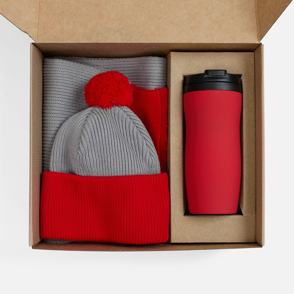 шарф, шапка - акрил 100%; термостакан - нержавеющая сталь, покрытие софт-тач, крышка, внутренняя колба - пластик; покрытие софт-тач; крышка, внутренняя колба - пластик; коробка - микрогофрокартон, Т-23Е