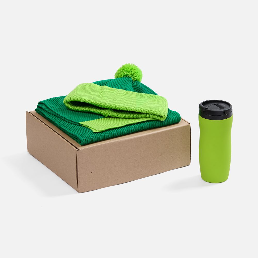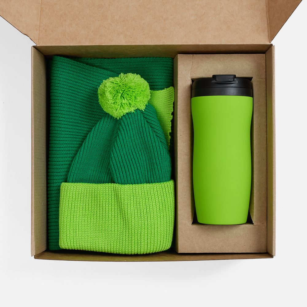 шарф, шапка - акрил 100%; термостакан - нержавеющая сталь; покрытие софт-тач; крышка, внутренняя колба - пластик; коробка - микрогофрокартон, Т-23Е