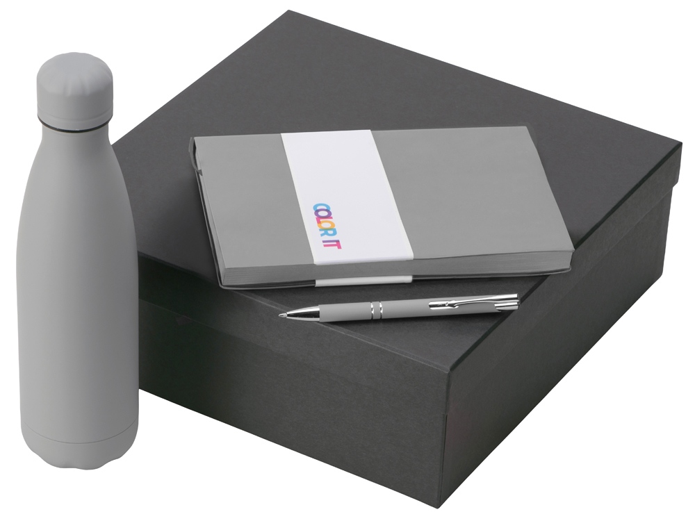 блокнот - искусственная кожа с покрытием софт-тач, ручка - алюминий с покрытием софт-тач, термобутылка - нержавеющая cталь с покрытием софт-тач, коробка - картон 70 г/м2