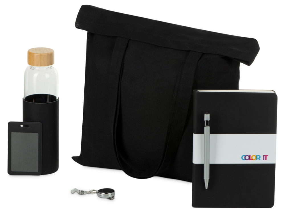 Welcome pack для нового сотрудника, в который входит все самое необходимое для комфортной адаптации в новом офисе: блокнот с магнитным держателем для ручки и карманом для визиток, ручка, чехол для пропуска с ретрактором, стеклянная бутылка для воды и шоппер. На все товары в наборе можно нанести ваш лого.