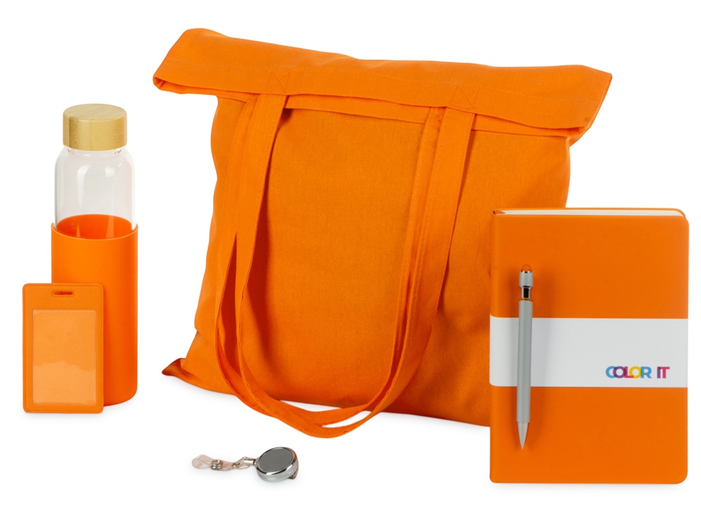 Welcome pack для нового сотрудника, в который входит все самое необходимое для комфортной адаптации в новом офисе: блокнот с магнитным держателем для ручки и карманом для визиток, ручка, чехол для пропуска с ретрактором, стеклянная бутылка для воды и шоппер. На все товары в наборе можно нанести ваш лого.