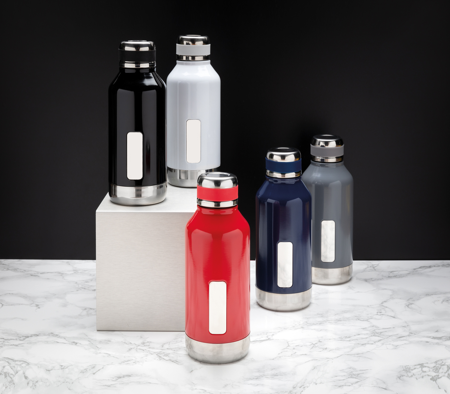 Герметичная вакуумная бутылка с закручивающейся крышкой. На лицевой стороне расположен шильдик под нанесение логотипа. Внутренняя часть из 304 нержавеющей стали и поверхность из 201 нержавеющей стали сохранят ваши напитки горячими до 5 часов и холодными до 15 часов. Объем 500 мл.