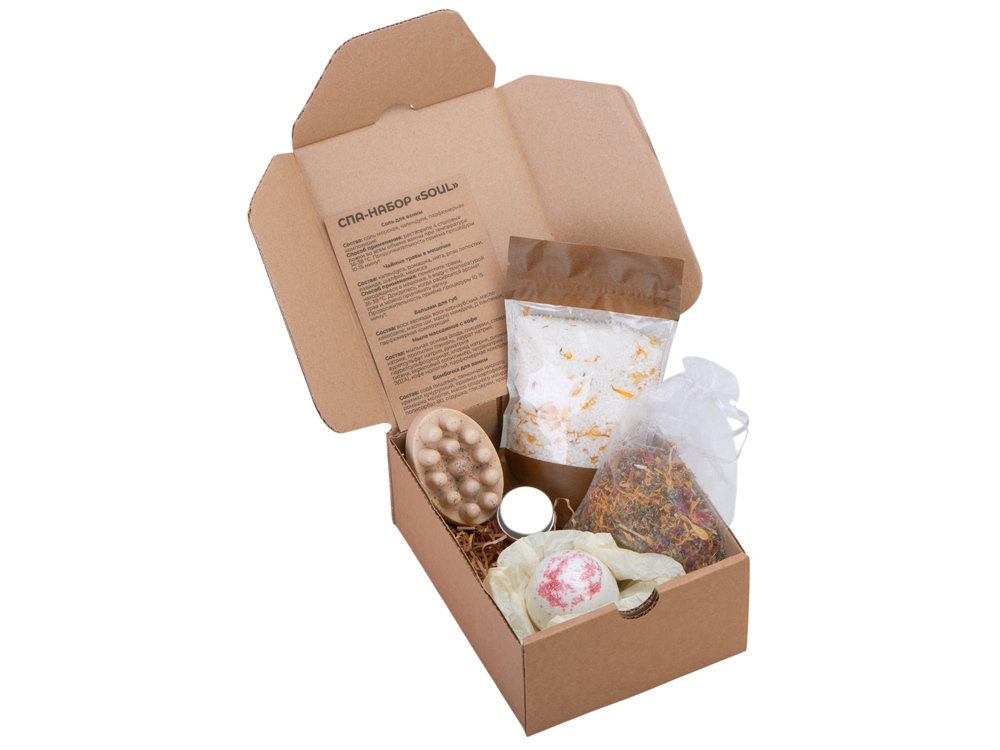 Подарите себе роскошный спа-уход прямо у себя дома с набором для тела "Soul", созданным исключительно из натуральных ингредиентов! В этом наборе вы найдете все необходимое для расслабления, очищения и питания вашей кожи, чтобы она выглядела здоровой и сияющей. В набор входят: - Соль для ванны: натуральная морская соль, смешанная с календулой обогащена минералами, она поможет снять напряжение и усталость, расслабить мышцы и улучшить кровообращение. Соль также способствует выведению токсинов из организма и укреплению иммунной системы. - Бомбочка для ванны: Насладитесь волшебным моментом, когда ароматная бомбочка растворится в вашей ванне, превратив ее в настоящее произведение искусства. Она наполнит вашу ванну приятным ароматом ромашки и подарит вашей коже мягкость и увлажнение. - Травяной сбор для ванны: Уникальный сбор из целебных трав, таких как календула, ромашка, лаванда и мята, поможет успокоить кожу, снять раздражение и воспаление, а также улучшить ее общее состояние. - Бальзам для губ: Нежный бальзам для губ, созданный на основе натуральных масел и восков, обеспечат вашим губам интенсивное увлажнение и защиту от обветривания и сухости. В составе масло ши, масло кокосовое, масло миндаля, воск авокадо, Д пантенол и парфюмерная композиция. - Кофейное мыло-скраб: Данный продукт мягко и нежно отшелушит вашу кожу, удалив омертвевшие клетки и стимулировав кровообращение. Кофеин, содержащийся в кофе, поможет уменьшить целлюлит и придать вашей коже тонус и упругость. Все компоненты набора "Soul" имеют натуральный состав и не содержат вредных химических веществ. Срок годности набора составляет 24 месяца, что гарантирует его длительное использование. Позвольте себе насладиться минутами блаженства и ухода за своим телом! Спа-набор "Soul" станет отличным подарком для вас или ваших близких, которые ценят натуральность и качество. Состав: - Соль для ванны: соль морская, календула, парфюмерная композиция. 300 г. - Чайные травы в мешочке: календула, ромашка, мята, роза, лаванда. 25 г. - Бальзам для губ: масло ши, масло кокосовое, масло миндаля, воск авокадо, Д пантенол, парфюмерная композиция. - Мыло массажное с кофе: мыльная основа (Вода, глицерин, стеарат натрия, пропилен гликоль, лаурат натрия, ауретсульфат натрия, динатрия лауретсульфосукцинат, хлорид натрия, диоксид титана, акриловый сопилимер, тетранатрия ЭДТА), кофе молотый, парфюмерная композиция. - Бомбочка для ванны: сода пищевая, лимонная кислота, крахмал кукурузный, крахмал картофельный, масло сладкого миндаля, полисорбат-80, отдушка, глицерин, краситель.