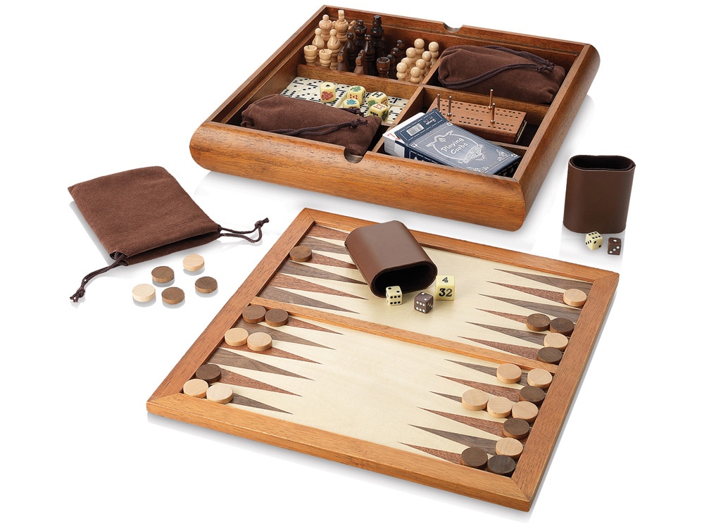 Роскошный подарок для человека с хорошим вкусом. Стилизация под антиквариат. Набор из 6 популярных настольных игр: шахматы, нарды, криббедж, игральные карты, домино, игральные кости. Футляр-игровое поле выполнен из натурального дерева. Отличный имиджевый сувенир в винтажном стиле.
