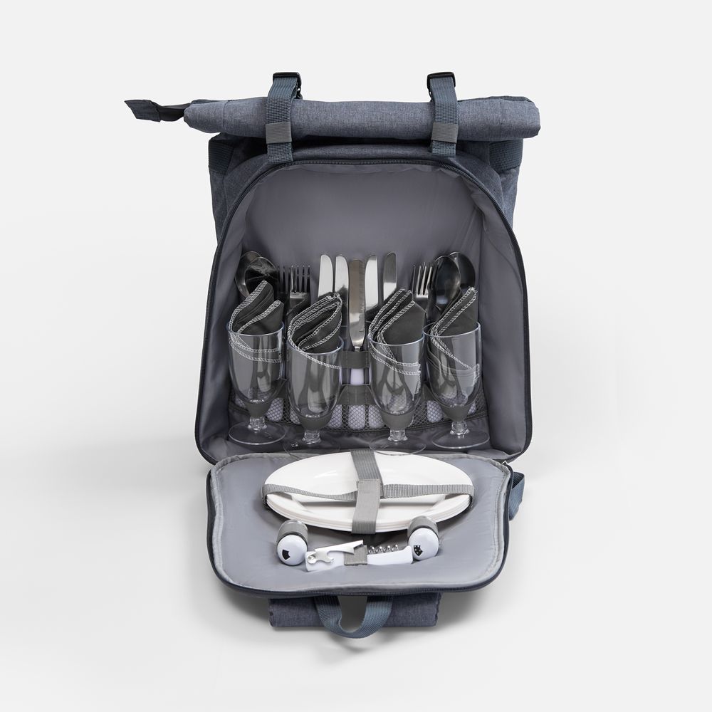 рюкзак - переработанный полиэстер, 300D с полиуретановой пропиткой, PEVA; тарелки и бокалы - полистирол; приборы - нержавеющая сталь, пластик