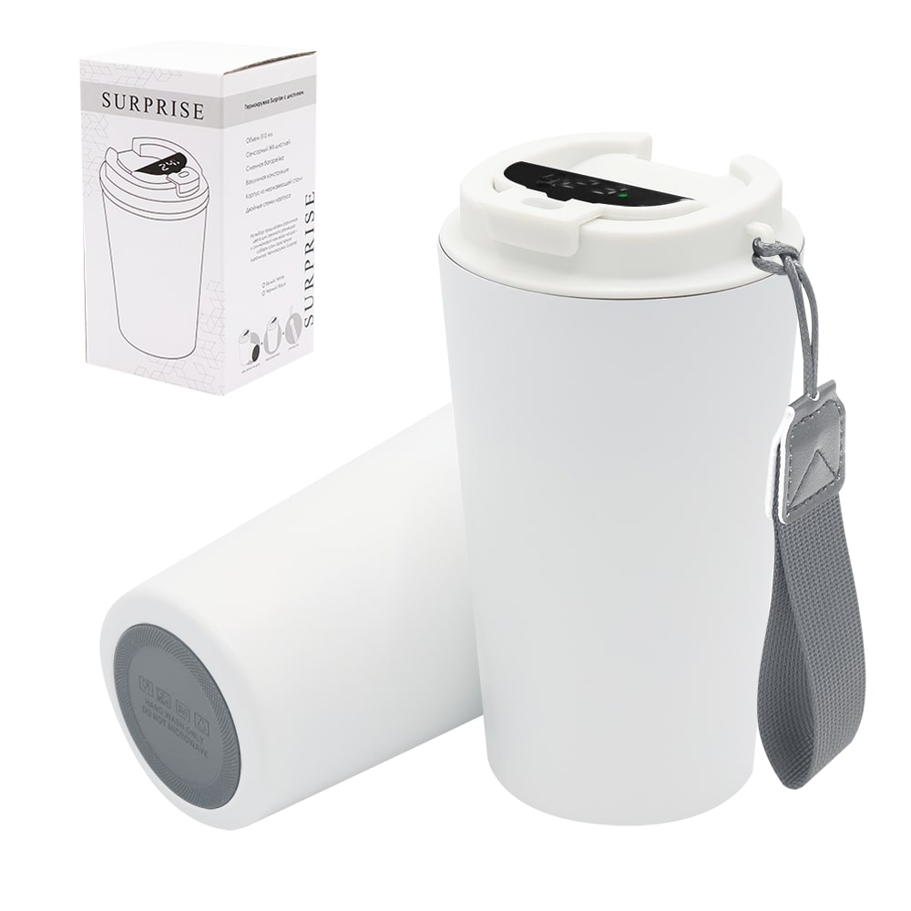 Термокружка Surprise To Go с дисплеем выполнена из пищевой нержавеющей стали. Имеет двойные стенки с вакуумной изоляцией, а крышка изготовлена из пищевого безопасного для человека пластика. Термокружка Surprise To Go не только сохраняет ваши напитки горячими, но и показывает температуру напитка! Уникальная особенность данной термокружки – наличие сенсорного индикатора температуры, расположенного в крышке. Чтобы узнать температуру напитка внутри кружки, достаточно прикоснуться к поверхности крышки. Работает от 1 батарейки типа CR2032 (в комплекте), которую в последующем можно самостоятельно заменить. - качественные и безопасные материалы - двойные стенки из нержавеющей стали - сенсорный ЖК-дисплей - информация о температуре жидкости - батарею можно заменить самостоятельно -отличные теплоизоляционные свойства - эргономичный дизайн - удобная форма В комплект уже входит силиконовая накладка и шнурок. Насладись своим кофе в компании термокружки Surprise To Go!