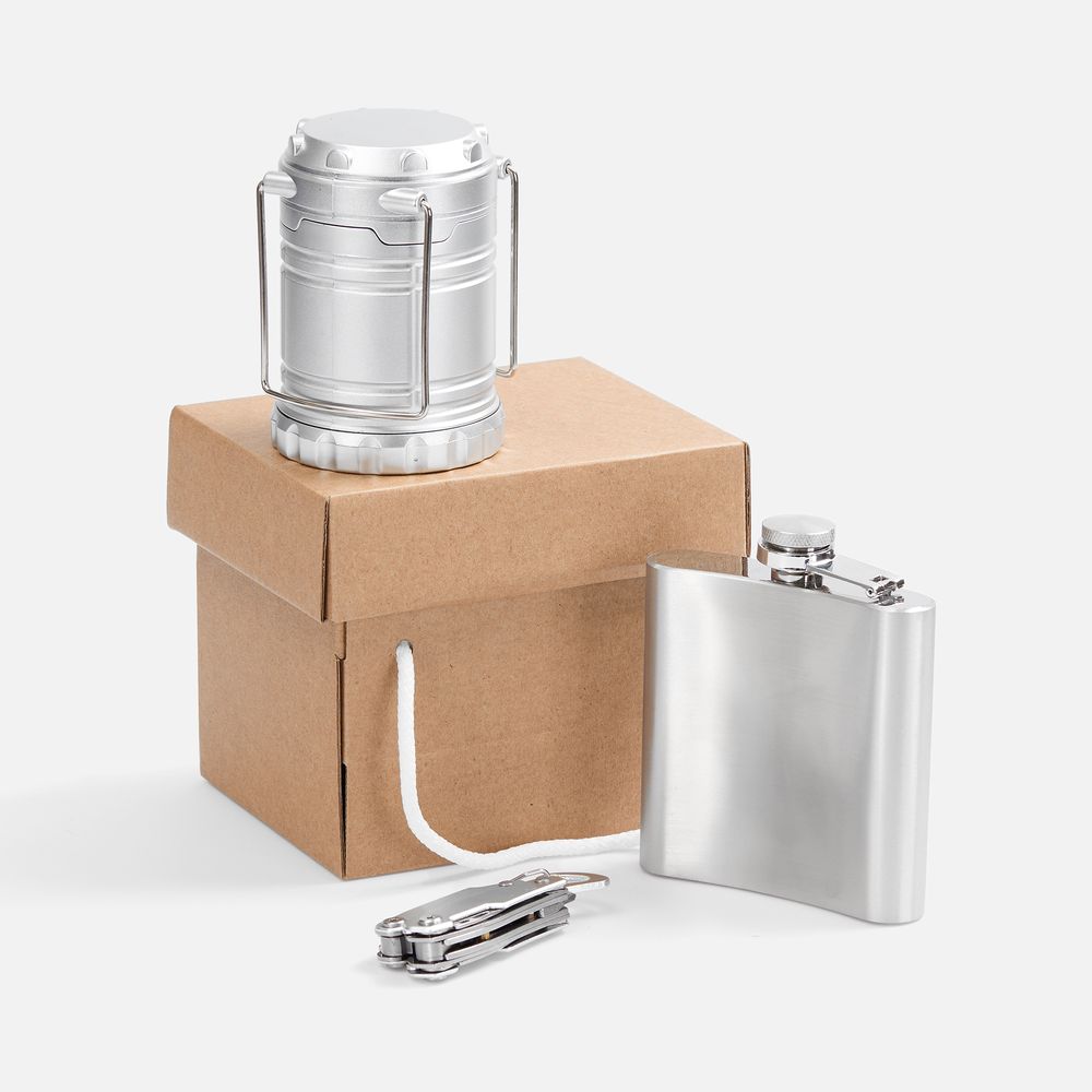 мультитул - нержавеющая сталь; алюминий; фляжка - нержавеющая сталь, 304; фонарь - АБС-пластик; коробка - микрогофрокартон
