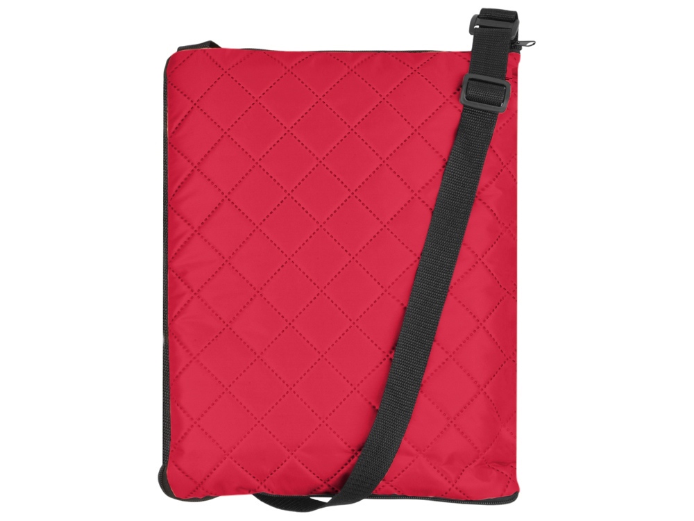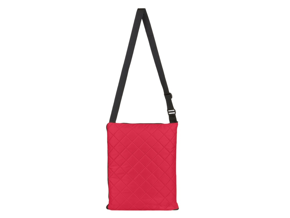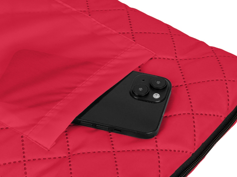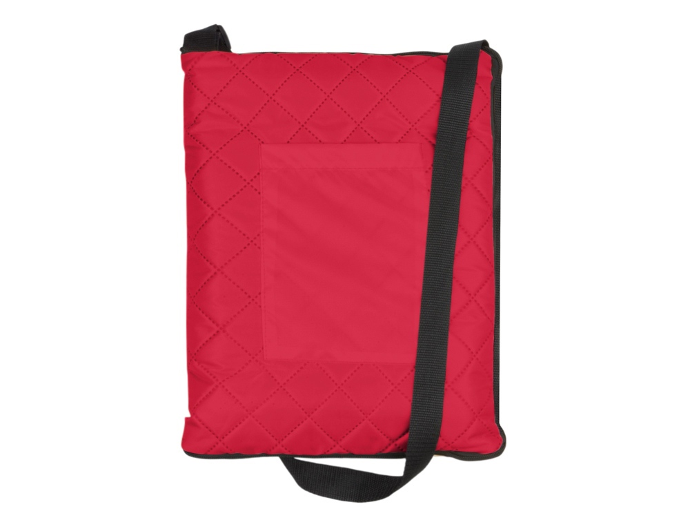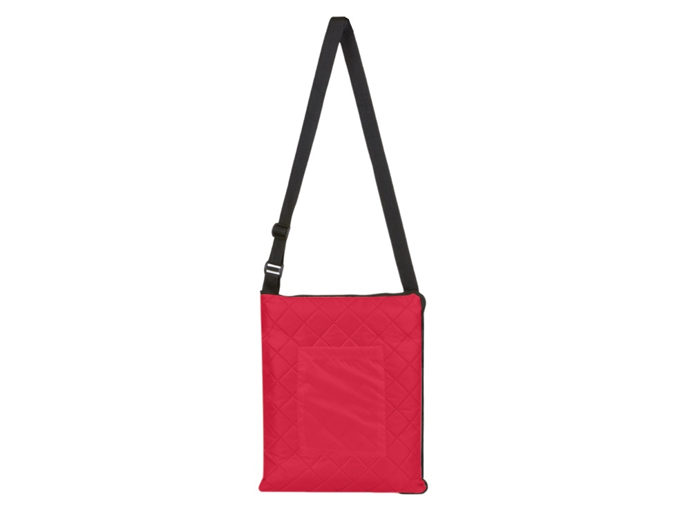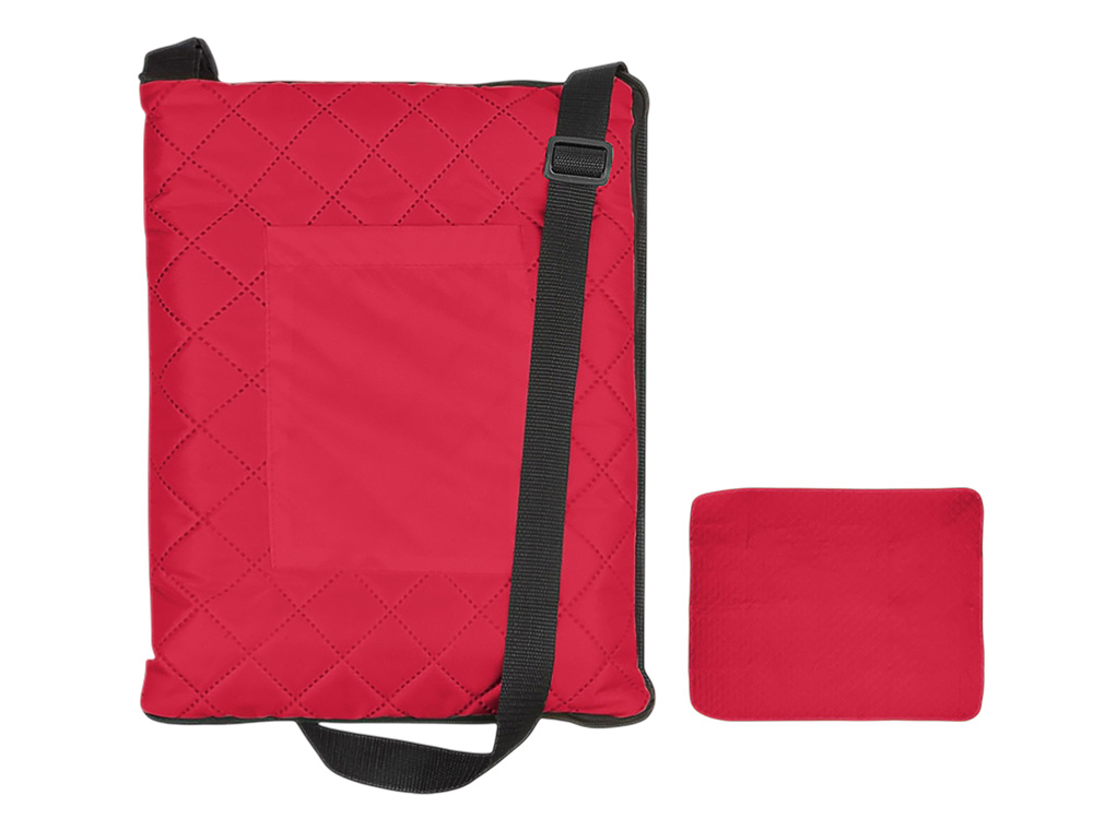 Двухсторонний плед с водоотталкивающим покрытием с одной стороны и мягким флисом с другой. Складывается в сумку на плечо и фиксируется с помощью молнии. В собранном виде имеет регулируемый по длине ремень для переноски и наружный карман для мелочей.