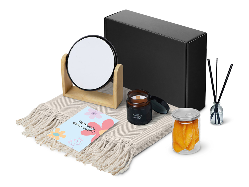Наборы серии Re: напоминают: важнее всего человек, а не его роль. Они дарят возможность замедлиться и насладиться настоящим. Каждый набор — как мини-ритуал: согреться, почувствовать себя, поблагодарить и восстановиться после дней, полных скорости, дедлайнов и шума. Re:f. — наборы для неё, наборы для мягкой гармонии и перезагрузки, которые дарят возможность замедлиться, восстановить ресурс и почувствовать заботу в каждом моменте. Re:f. Shelter — о чувстве защищённости и тихом пространстве для себя. Укутайтесь в плед, зажгите свечу, пусть диффузор наполнит комнату мягким ароматом — так создаётся настроение покоя и уюта. Зеркало становится маленькой деталью внимания к себе, а сушёное манго добавляет солнечную, тёплую нотку, напоминая о простых радостях. Этот набор — про личное укрытие, где можно выдохнуть, замедлиться и просто побыть в моменте.