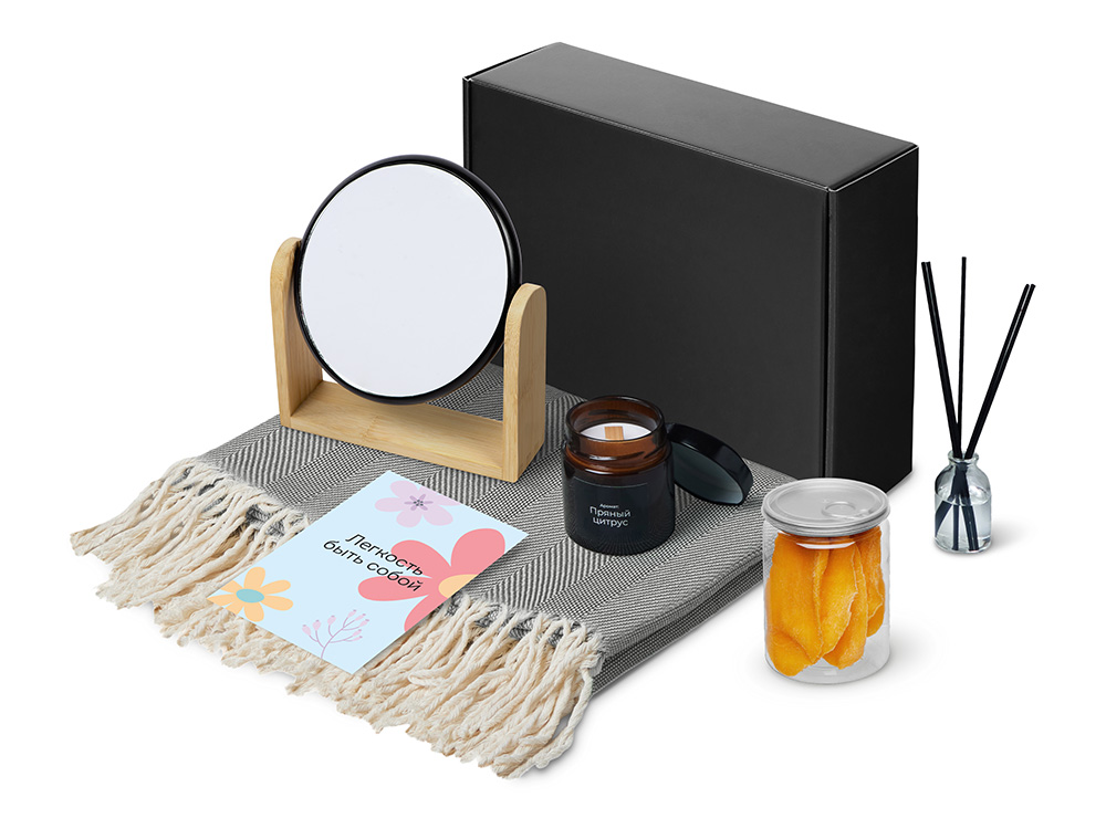 Наборы серии Re: напоминают: важнее всего человек, а не его роль. Они дарят возможность замедлиться и насладиться настоящим. Каждый набор — как мини-ритуал: согреться, почувствовать себя, поблагодарить и восстановиться после дней, полных скорости, дедлайнов и шума. Re:f. — наборы для неё, наборы для мягкой гармонии и перезагрузки, которые дарят возможность замедлиться, восстановить ресурс и почувствовать заботу в каждом моменте. Re:f. Shelter — о чувстве защищённости и тихом пространстве для себя. Укутайтесь в плед, зажгите свечу, пусть диффузор наполнит комнату мягким ароматом — так создаётся настроение покоя и уюта. Зеркало становится маленькой деталью внимания к себе, а сушёное манго добавляет солнечную, тёплую нотку, напоминая о простых радостях. Этот набор — про личное укрытие, где можно выдохнуть, замедлиться и просто побыть в моменте.