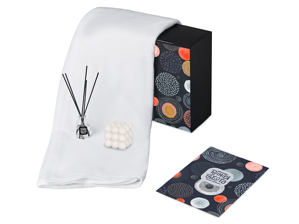 плед - флис, полиэстер, диффузор - стекло, свеча - 90% парафин очищенный, 10% соевого воска, фитиль хлопковый, миндаль - пластик, мешок - нетканый материал (спанбонд), коробка - картон 160 г/м2 ± 10%