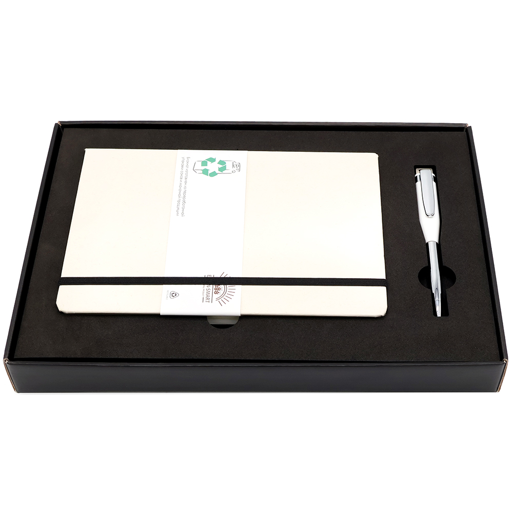 "Fantazy stream" — Подарочный набор в элегантной цветной коробке черного цвета с конструкцией крышка-дно. Внутри расположен ложемент, специально разработанный для надежного и аккуратного размещения всех элементов набора. В набор входят стильный ежедневник с плотной обложкой (арт.51013.02) и металлическая ручка с флэшкой на 64GB (арт1043.01), идеально дополняющая комплект. Ежедневник имеет высококачественную обложку и удобный формат для записи важных дел и заметок, а ручка c флешкjq сочетает в себе элегантный дизайн и практичную функцию хранения цифровой информации. Такой комплект станет идеальным подарком для деловых людей, ценящих сочетание классики и современных технологий.