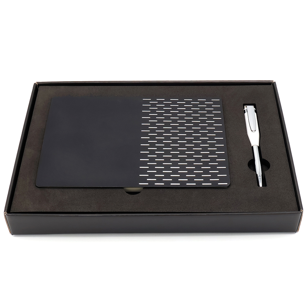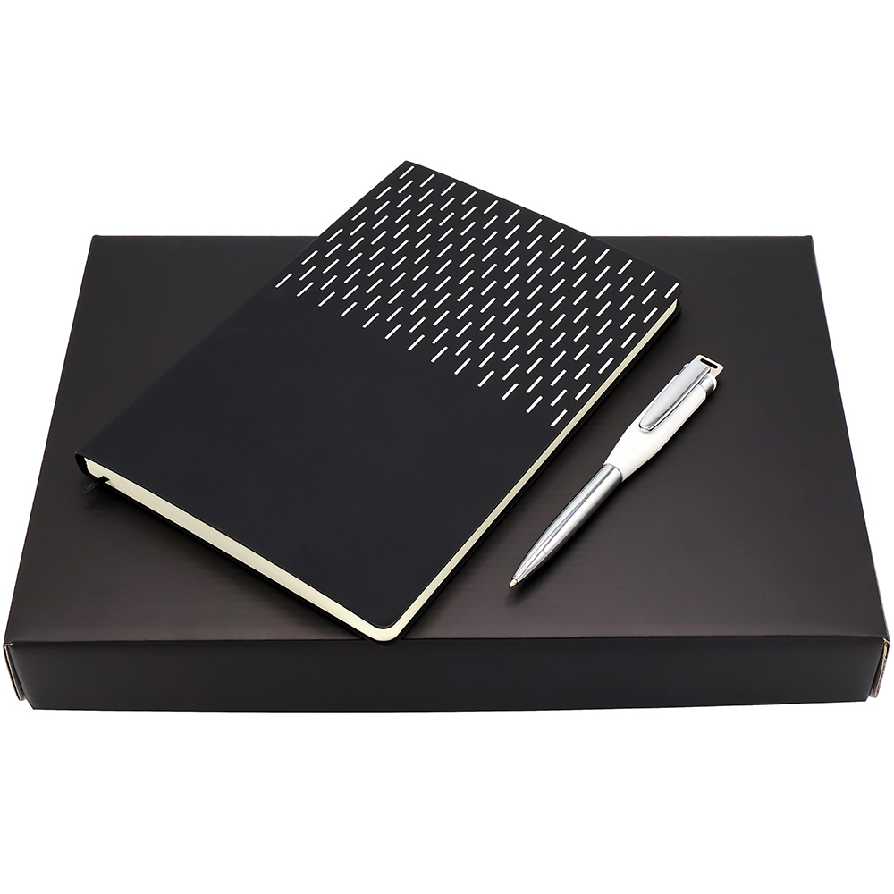 Подарочный набор в стильной цветной картонной коробке черного цвета (крышкой-дно). Внутри на аккуратном ложементе располагаются ежедневник А5 и элегантная металлическая ручка - флешка емкостью 64 ГБ. Состав набора: Ежедневник A5 недатированный Esmeralda в мягком переплёте, чёрный/серебряный (артикул 51014.02.09) - 1 шт. Ручка металлическая Memphys c флешкой 64Гб, белый (артикул 1043.01) - 1 шт. Коробка Warrant с матовой поверхностью, чёрный (артикул RUS5052.19) - 1 шт.