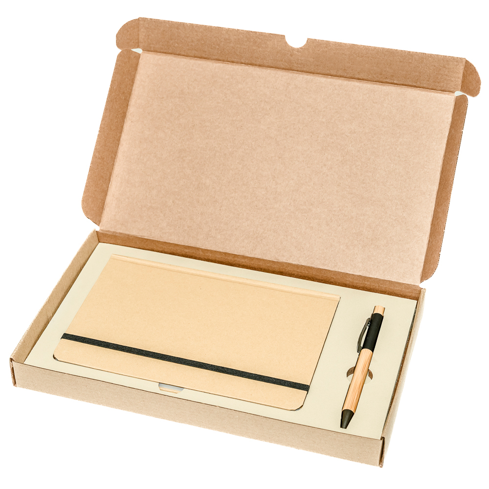 Подарочный набор в стильной картонной коробке бежевого цвета (крышкой-дно). Внутри на аккуратном ложементе располагаются блокнот в твердом переплете и ручка из бамбука. Состав набора: Блокнот Элвин в твёрдом переплёте, черный (арт. 51004.02) - 1 шт. Ручка Авалон с корпусом из бамбука и софт-тач вставкой, черный (арт. 1050.02) - 1 шт. Самосборная коробка из бурого микрогофрокартона (арт. RUS5055.19) - 1 шт.