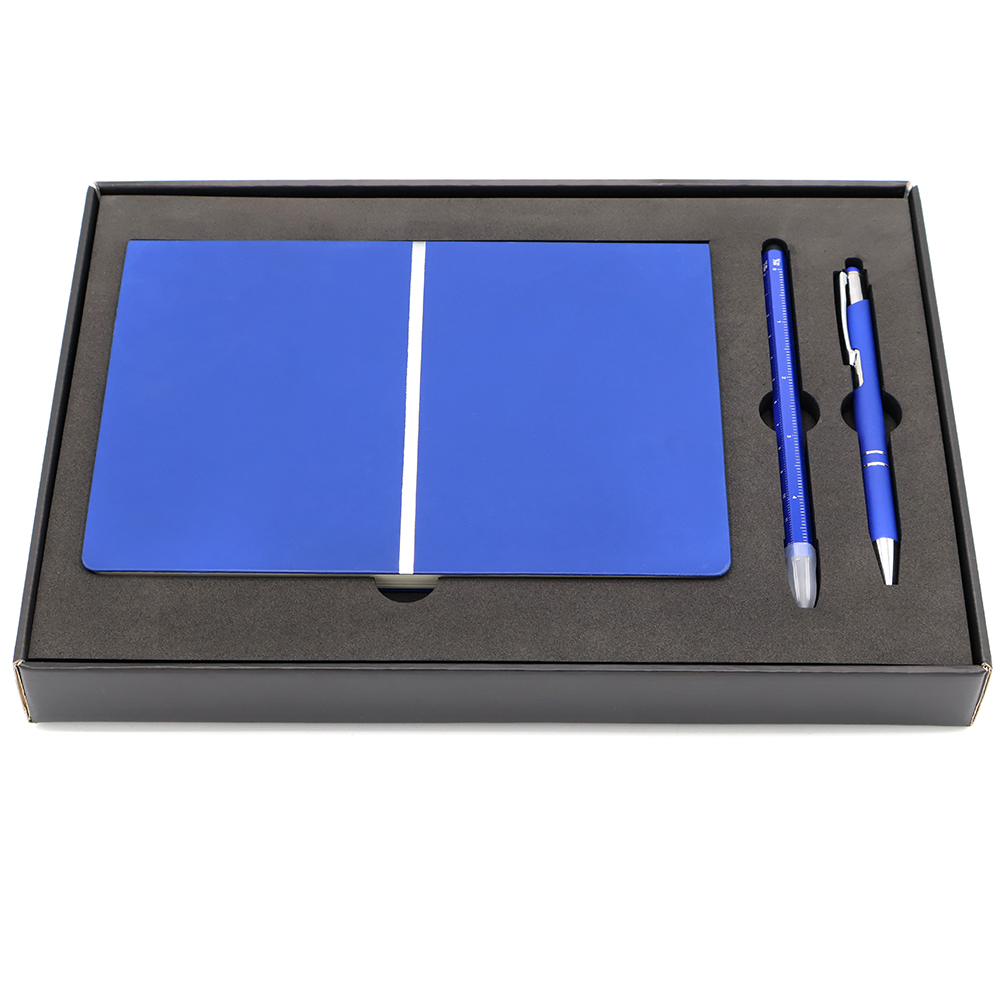 Подарочный набор в стильной цветной картонной коробке черного цвета (крышкой-дно). Внутри на аккуратном ложементе располагаются ежедневник, ручка металлическая, и вечный карандаш. Состав набора: Ежедневник A5 недатированный Equator, синий (арт. 51015.26.09) - 1 шт. Ручка металлическая Ingrid софт-тач, синий (арт. 1039.03) - 1 шт. Вечный карандаш Timeless со стилусом, синий (арт. 1076.03) - 1 шт.