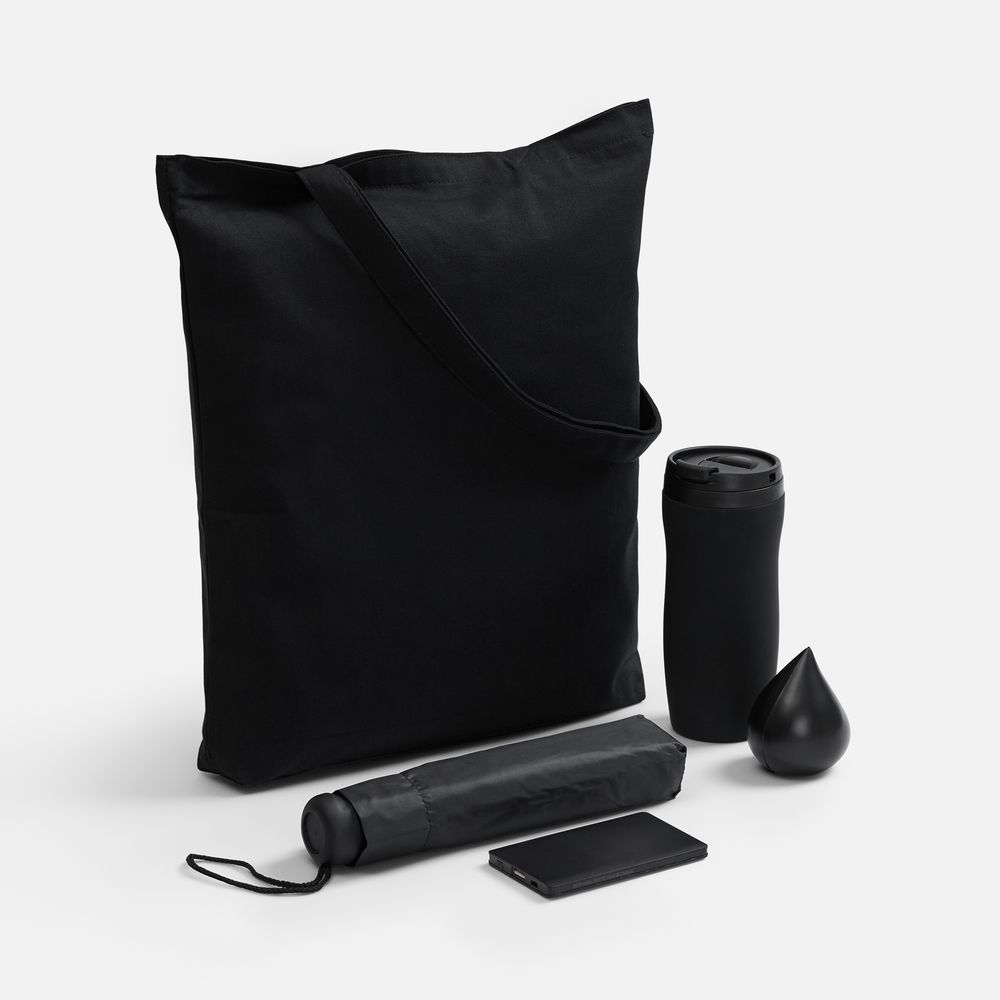 зонт - полиэстер 190T, ручка - пластик; покрытие софт-тач; каркас, спицы - металл; аккумулятор - пластик; крышка термостакана, внутренняя колба - пластик, корпус - нержавеющая сталь; покрытие софт-тач; сумка - хлопок 100%, плотность 210 г/м²; антистресс - вспененный полиуретан
