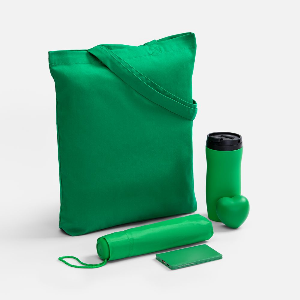 зонт - полиэстер 190T, ручка - пластик; покрытие софт-тач; каркас, спицы - металл; аккумулятор - пластик; крышка термостакана, внутренняя колба - пластик, корпус - нержавеющая сталь; покрытие софт-тач; сумка - хлопок 100%, плотность 210 г/м²; антистресс - вспененный полиуретан