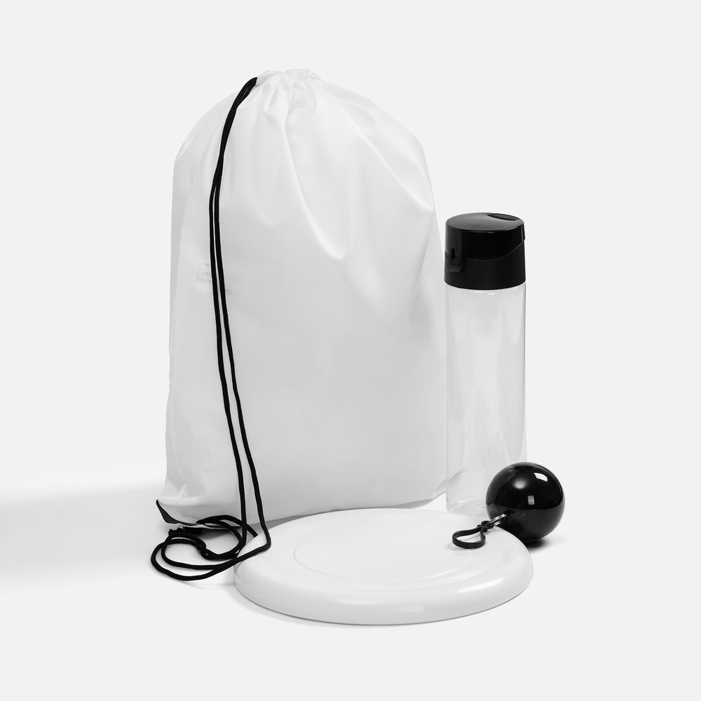 Набор FestiFun, черный (бутылка: диаметр 6,5 см; высота 24 см; футляр для плаща: диаметр 6,6 см; плащ: 120х90 см; тарелка-фрисби: диаметр 23 см, высота 2 см; рюкзак-мешок: 37х47 см)