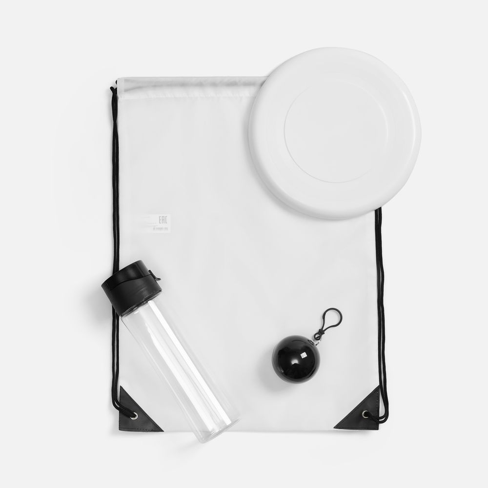 бутылка, футляр, тарелка-фрисби - пластик; плащ - полиэтилен, ПНД, плотность 12 мкм; рюкзак-мешок - спанбонд, плотность 70 г/м²